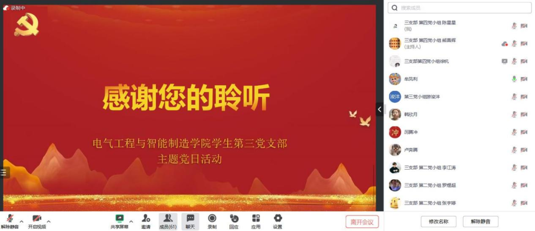 为深入学习贯彻宣传习近平新时代中国特色社会主义思想,加强党员思想教育和理论学习,弘扬党的优良传统和革命精神,1月27日,电气工程与智能制造学院学生第三党支部于腾讯会议开展“向榜样学习--唐菊兴:奋战高原,寻矿报国”为主题的党日活动。本次党日活动由副书记陈永华老师、教师党员牟凤利老师及支部全体党员、入党积极分子参加,徐杭同学主讲。