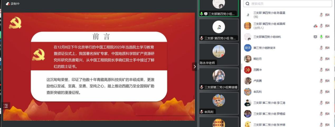活动开始,会议成员通过观看《榜样8》,深入的了解了唐菊兴同志的故事。从2017年入选国土资源部科技创新领军人才、获得全国创新争先奖状、被选为中国共产党第十九次全国代表大会代表,到如今的成功增选为中国工程院院士,唐菊兴一步一个脚印,每一步都充满艰辛,每一步都扎扎实实。