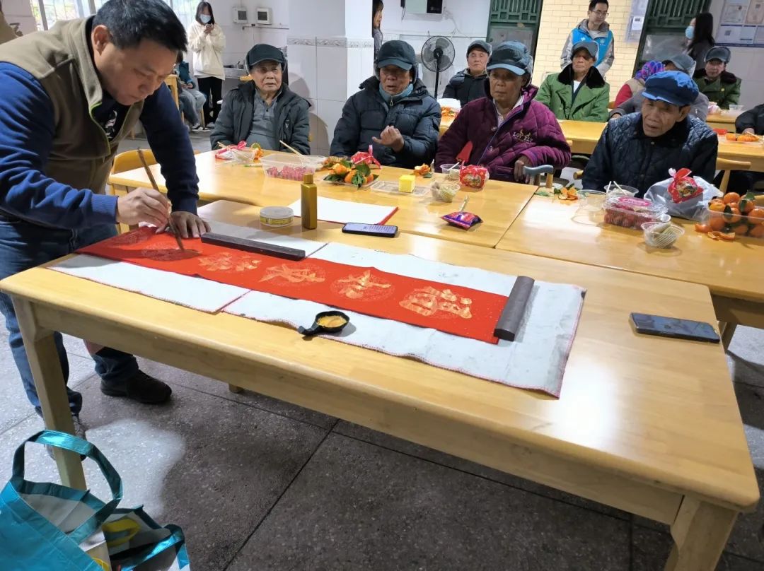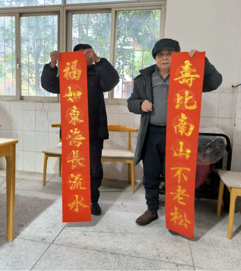 图3-图4:深圳市九方通逊电商物流中山分公司客户经理林权荣提笔写对联,辞旧迎新春,为老人们送上春节祝福。