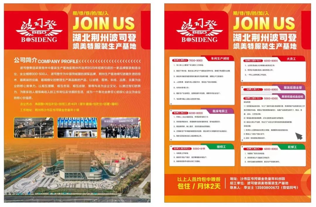 波司登集团飒美特华中服装生产基地是荆州市政府2023年招商引资的一家品牌服装制造企业,企业规模300-500人,波司登作为中国羽绒服的领军品牌,荆州生产基地将引进最先进的技术,最高端的设备,最精细化的管理生产高品质的产品。以诚信、服务、科技、品质、共赢为企业的妆心竞争力。以相互理解,相互包容,相互成就,荣辱与共为企业文化。以通过我们的努力,为更多的人提供高收入的工作岗位及优质的生活,成为一个有社会责任心的良心企业为企业的核心价值观。
