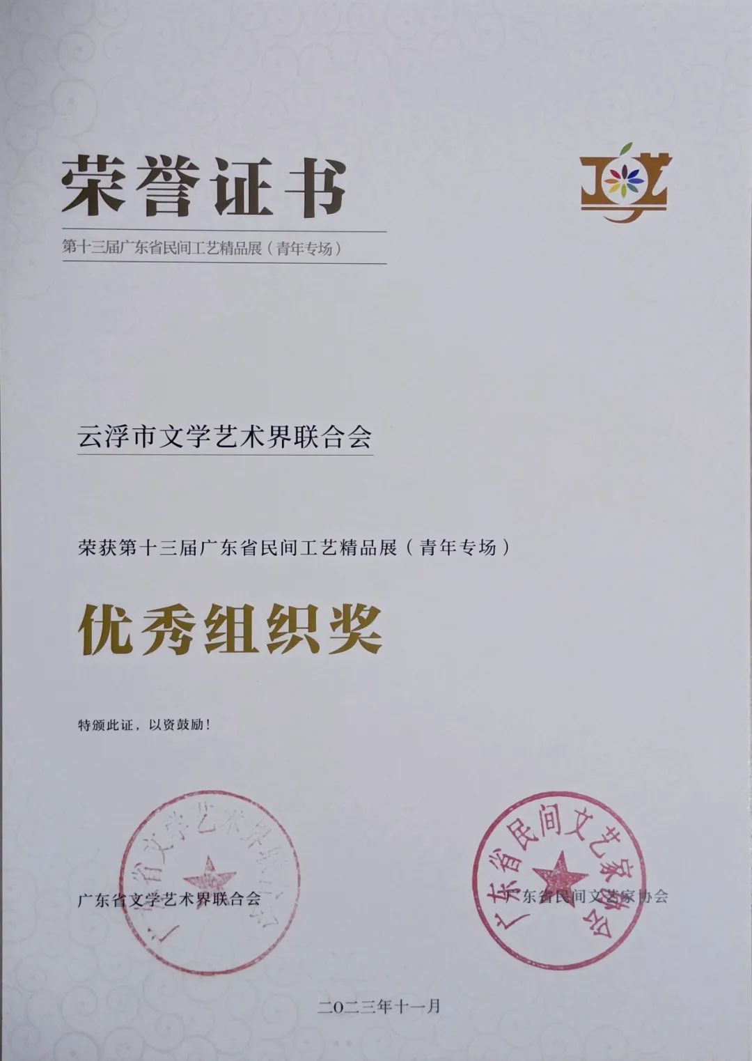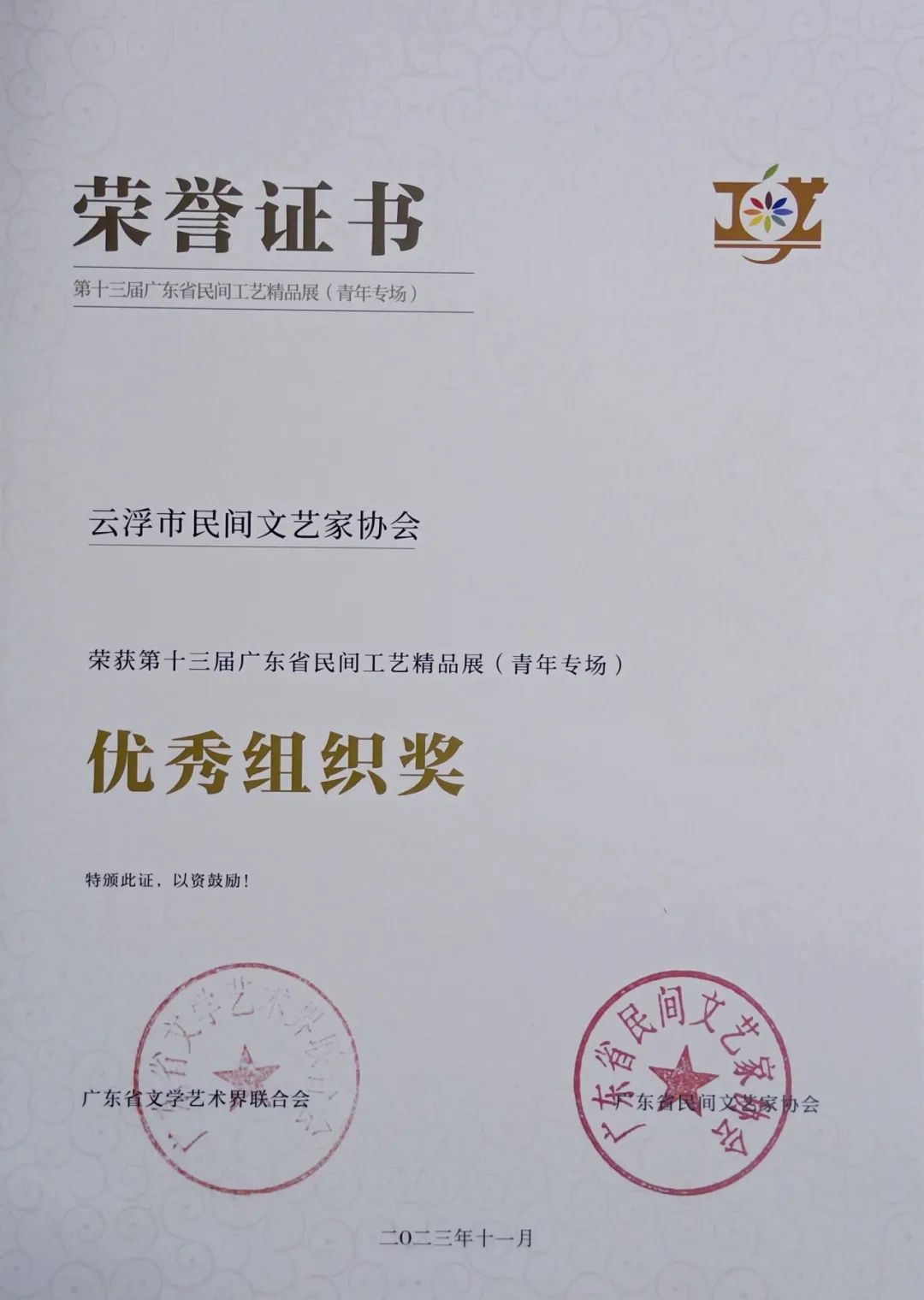 云浮民协依托“第九届中国(广东)民间工艺博览会暨第十三届广东民间工艺精品展(青年专场)”在国家级博览会平台展示我市特色优秀传统工艺、独特内涵文化艺术,让我市青年人才艺术精品亮相“青年专场”参展参评,24件民间艺术精品入展入围,并荣获1金、3铜、3优秀,市文联、市民协获“优秀组织奖”的好成绩。