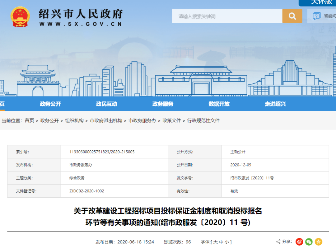 2021年4月21日,绍兴市人民政府发布《关于改革建设工程招标项目投标保证金制度和取消投标报名环节等有关事项的通知(绍市政服发〔2020〕11 号)》。