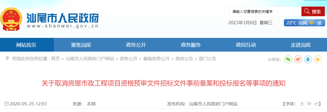 2020年5月,汕尾市政府发布《关于取消房屋市政工程项目资格预审文件招标文件事前备案和投标报名等事项的通知》。