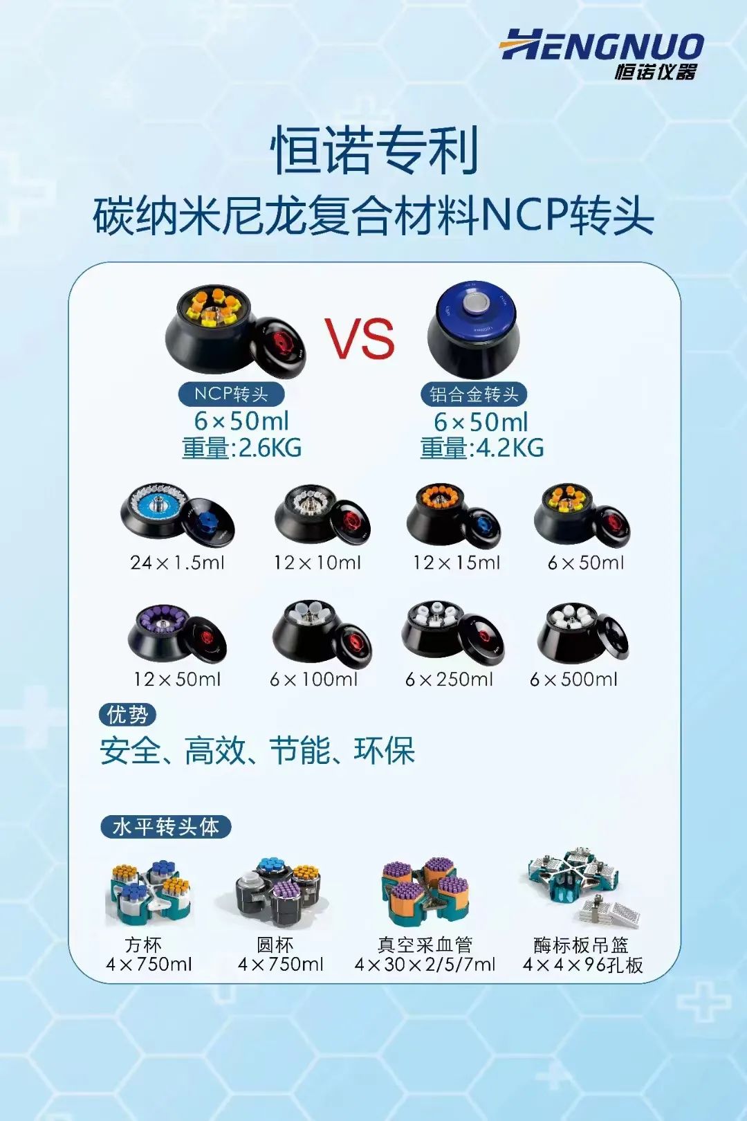 恒诺NCP转头具有优良的保温性能,能更好保护样品;转头离心角度更大,在相同离心力的情况下离心效果更好