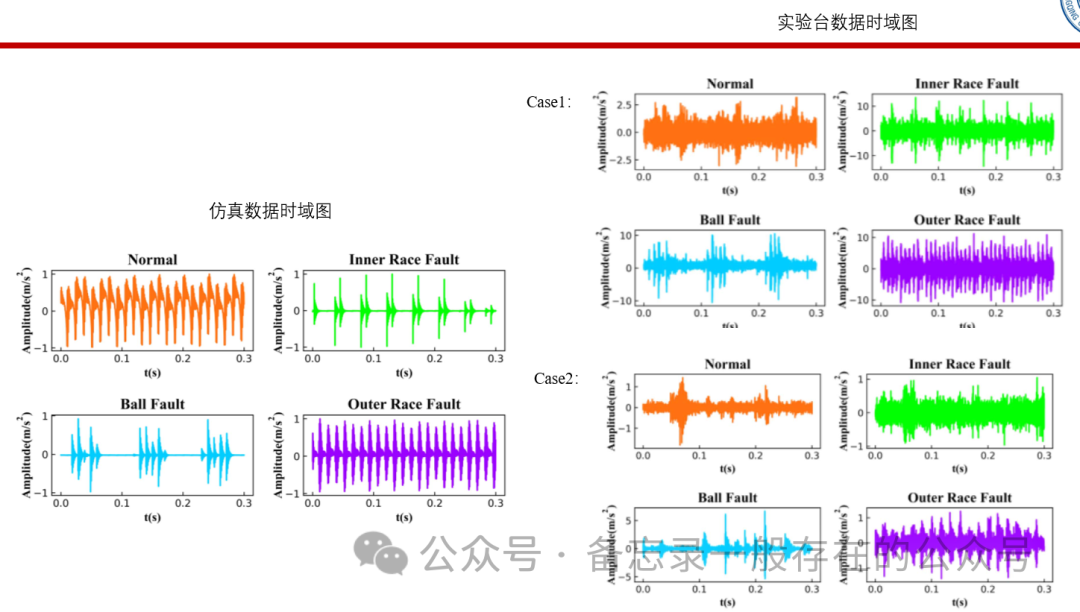 得到的仿真数据时域图如下,可以看到仿真数据与试验台得到的数据的形态是非常非常不一致的,但是细看的话他们是有略微相似之处。比如以内圈为例,一股一股的跟仿真的一股一股的在大体上的轮廓上是有一定相似度的,同样,这个滚子也是一样的,一股一股一股。这就是说这个物理的模型确实是蕴含了实验数据中的一些特征信息的,说明他们的领域适配是有一定道理的。当然,在这里边,我们可以考虑进一步的调参、加更高的约束、加噪声等,让他们的相似度更接近,更贴合实测环境。【Case1和Case2分别是论文中做的两个实例的实验数据图】