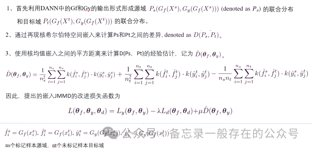 尽管公式(3那里)捕获了联合分布 Ps 和 Pt 中不同变量之间的交互,并显式计算源域和目标域之间的联合分布差异,但通常仍然①不足以准确表征动态变化的数据分布。而DANN学习的差异是一个隐式距离,可以在数据中动态学习,所以就将这个公式嵌入到DANN的公共损失函数中。②JMMD对齐源域和目标域的联合分布,DANN减少边缘分布差异,这两个可以同时帮助在无监督场景中调整他们的条件分布,克服了单独边缘分布对齐的局限性。