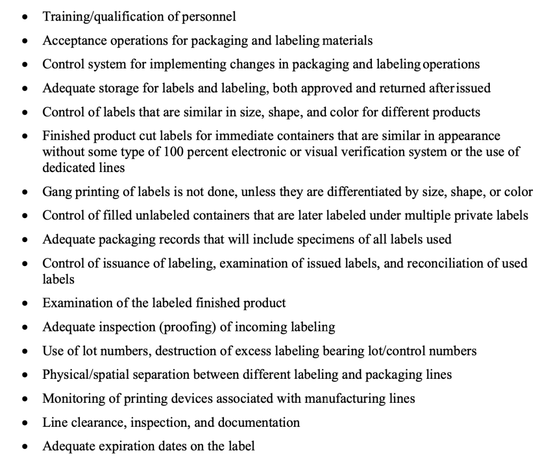 1 )人员培训与资质确定 2)包装贴签物料的认可 3)包装贴签操作的变更控制系统 4)足够的标签贮存,包括批准的和签发后退回的 5)尺寸、形状和颜色相近的不同产品的标签控制 6)没有100%电子或目视确认或者不是用于专线的、具有类似外观的成品直接容器的切割标签 7)除非标签按大小、形状或颜色区分,否则不进行标签钢印 8)对将在多个专用贴签线上贴签的已装填未贴签容器的控制 9)完善的包装记录,包含所有使用的标签的样本 10)标签发放的控制、发放标签的检查、已用标签的数量平衡 11)已贴签成品的检查 12)到货标签(打样)的充分检查 13)批号使用,对带有批号/控制号的多余标签的销毁 14)不同贴签和包装线之间的物理/空间分隔 15)与生产线相关的打印装置的监控 16)清场、检查和记录 17)符合防伪包装要求(见21CFR 211.132及CPG 450.500某些人用非处方药的防伪包装要求) 18)包装贴签操作的验证,包括计算机化过程的安全性和验证 19)对非预期差异的文件化的调查