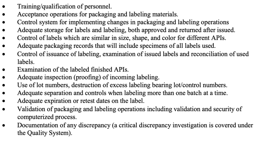 1)人员培训与资质确认 2)包装贴签物料的认可 3)包装贴签操作的变更控制系统 4)足够的标签贮存,包括批准的和签发后退回的 5)尺寸、形状和颜色相似的不同原料药的标签控制 6)完善的包装记录,包含所有使用标签的样本 7)标签发放的控制、发放标签的检查、已用标签的数量平衡 8)已贴签原料药的检查 9)标签来料(打样)的检查 10)批号使用、对带有批号/控制号的多余标签的销毁 11)在对不止一批产品同时包装时充分的分隔与控制 12)标签上的有效期或复验期 13)包装贴签操作的验证,包括计算机化过程的安全性和验证 14)记录任何非预期的差异(关键差异调查包含在质量体系下)