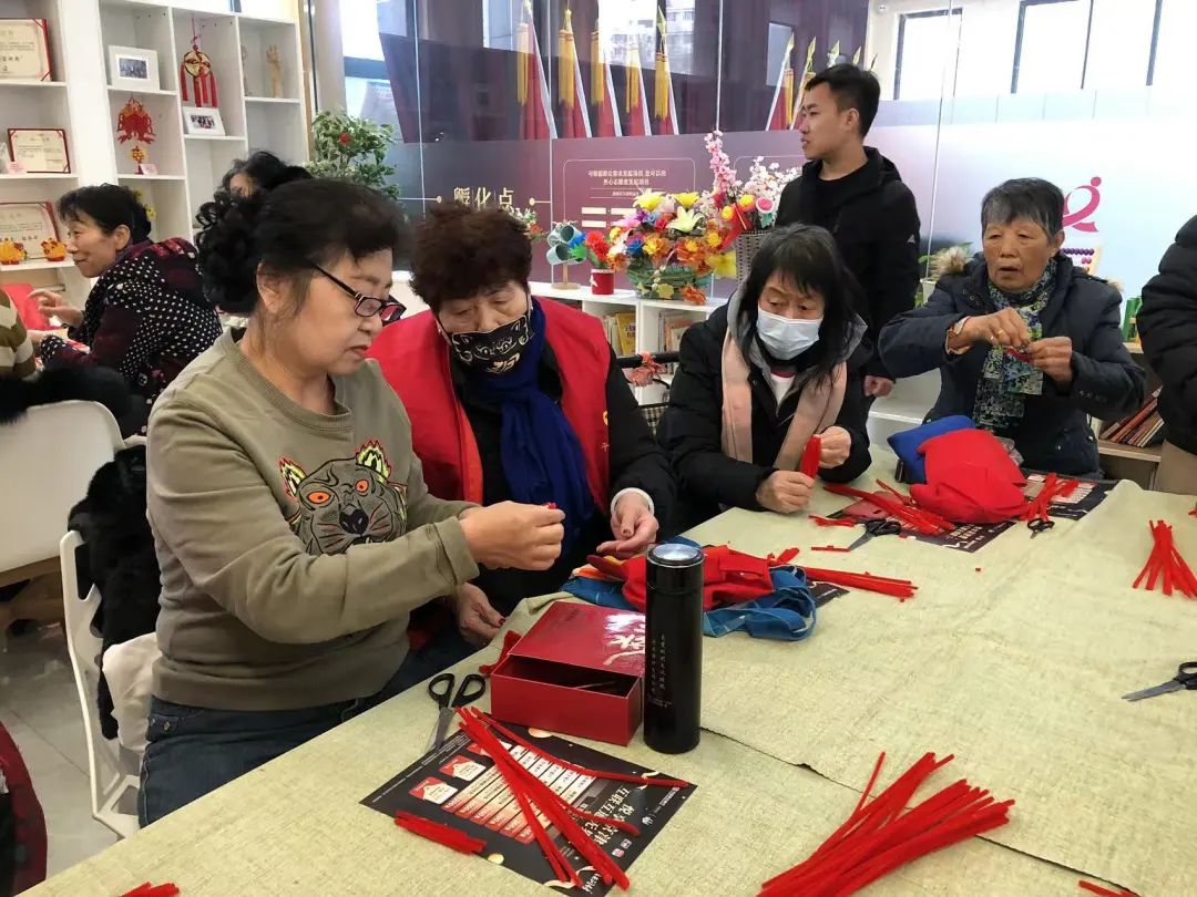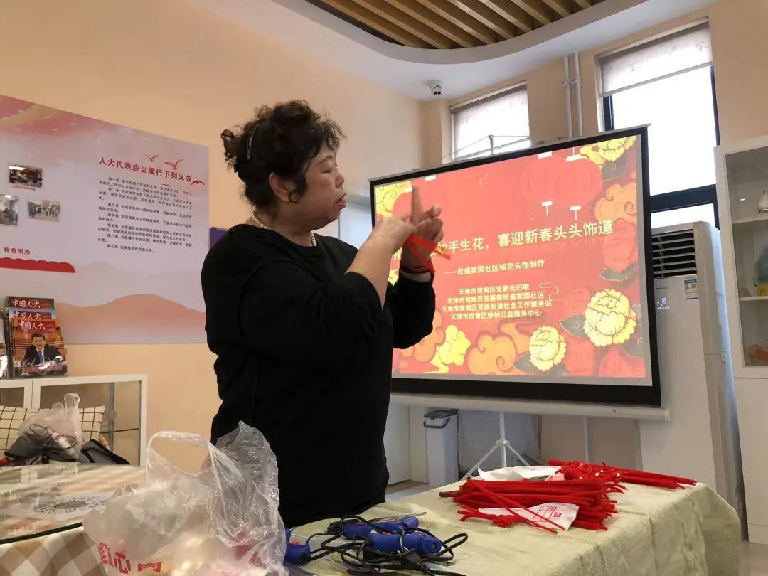 临近新年,为促进社区基金来源多元化,拓宽就业渠道,激发社会组织孵化中心能工巧匠们的创业热情和创收潜能,赤龙南街道社工站带领手工坊文创工坊组刘阿姨走进津南区双新街欣盛家园社区,为爱好手工艺品的居民们带来非遗红绒花发饰的精彩手工活动。