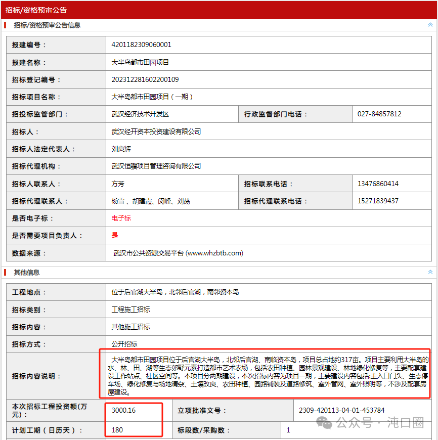 从武汉市公共资源网站获悉,大半岛都市田园项目(一期)开始招标预审。