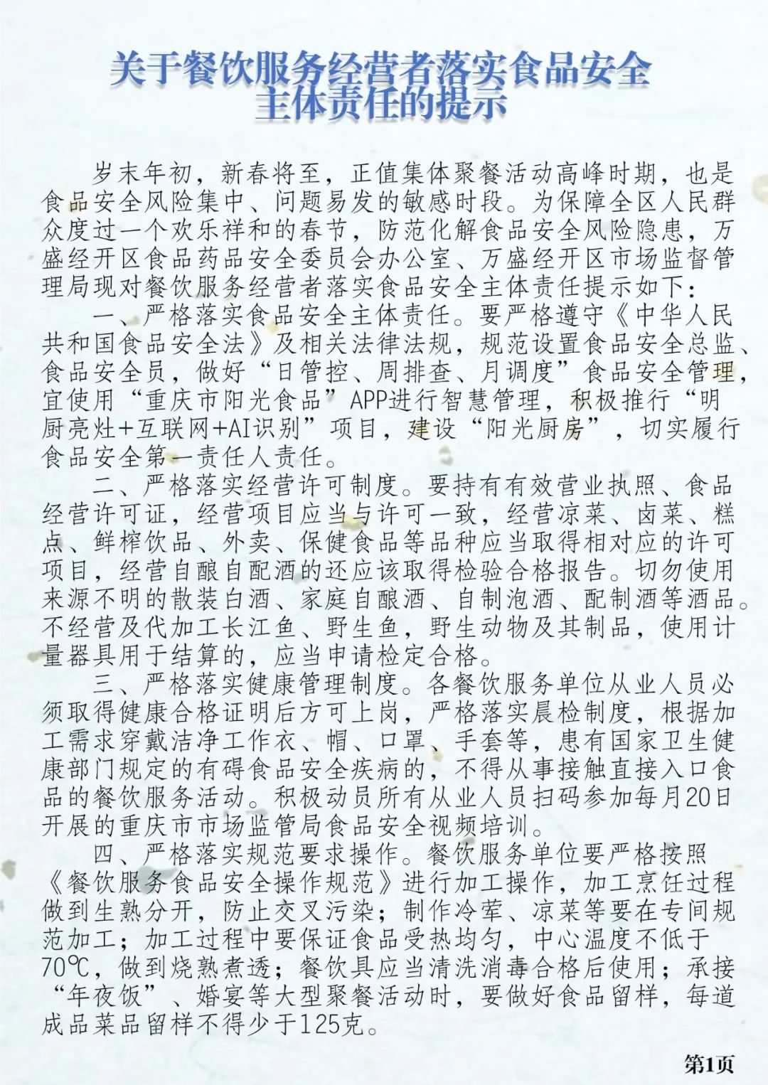 关于餐饮服务经营者落实食品安全主体责任的提示