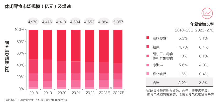 随着人均可支配收入持续增长,生活品质的提升是人们关注的重点,休闲零食市场规模稳重向好。在消费复苏的大背景下,2023年休闲零食市场预计同比增长5.0%,市场规模达到4884亿元人民币。