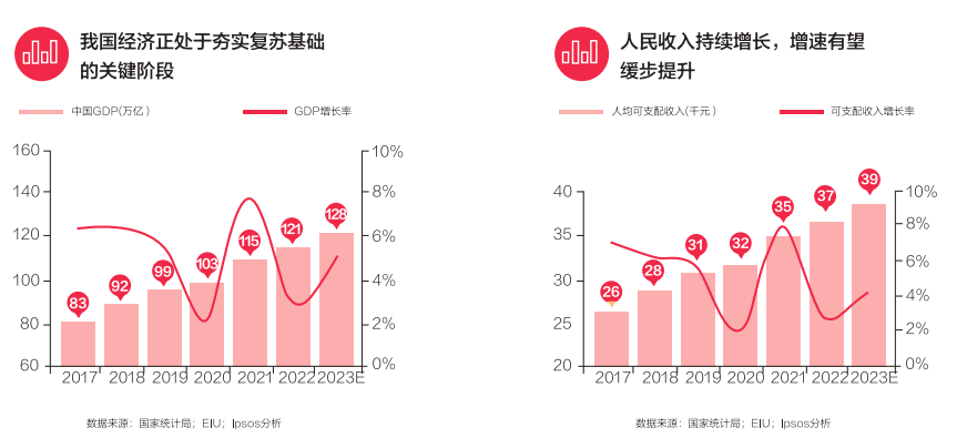 过去三年,在疫情和国际形势变化的双重挑战下,消费者信心受到影响。伴随人民正常生活、出行与娱乐队回归,人均收入水平也延续增长态势,有望缓步回升。