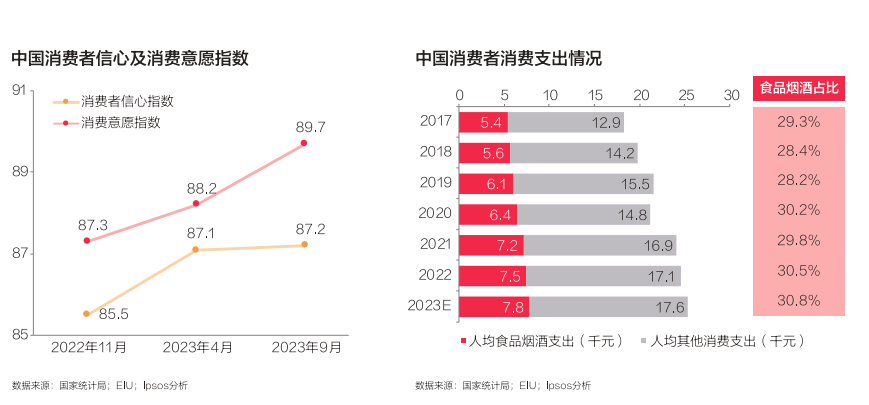 食品饮料具备刚性属性,呈现出高频,重复消费和抗周期属性,在疫情期间依然展现出强劲韧性。我国居民食饮消费占比在近年来已稳定达到30%以上,人均食品支出持续稳健增长,2017-2022年复合增长率达6.8%,高于人均总体消费支出增长水平。随着消费者信心逐渐回升,食品饮料消费领域更具增长态势,引领消费市场回暖。