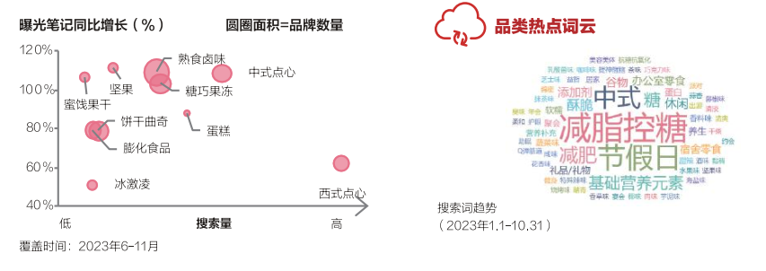 从细分品类的市场表现和声量来看,熟食卤味、肉干、坚果等咸味类零食由于具有高蛋白和优质营养,将称为驱动零食规模增长的核心品类,在体量及增量上凸显潜力;而如糖巧果冻等零食的市场规模虽然在过去有小幅下滑,但随着产品的不断创新带动产品声量快速提升,市场规模有望重新进入增长轨道。