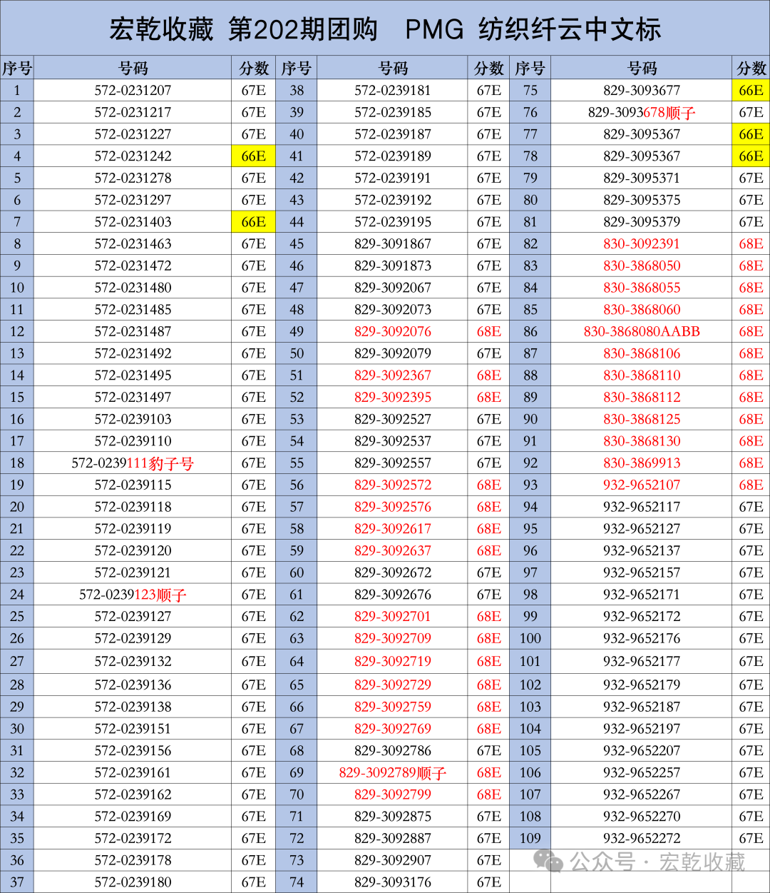 本期为出分现货团购,直接报序号单张确认,格式如:序号**起步或封顶,或者其他描述清楚的有效确认,如有出入请及时联系我们,团购结束以表格为准。