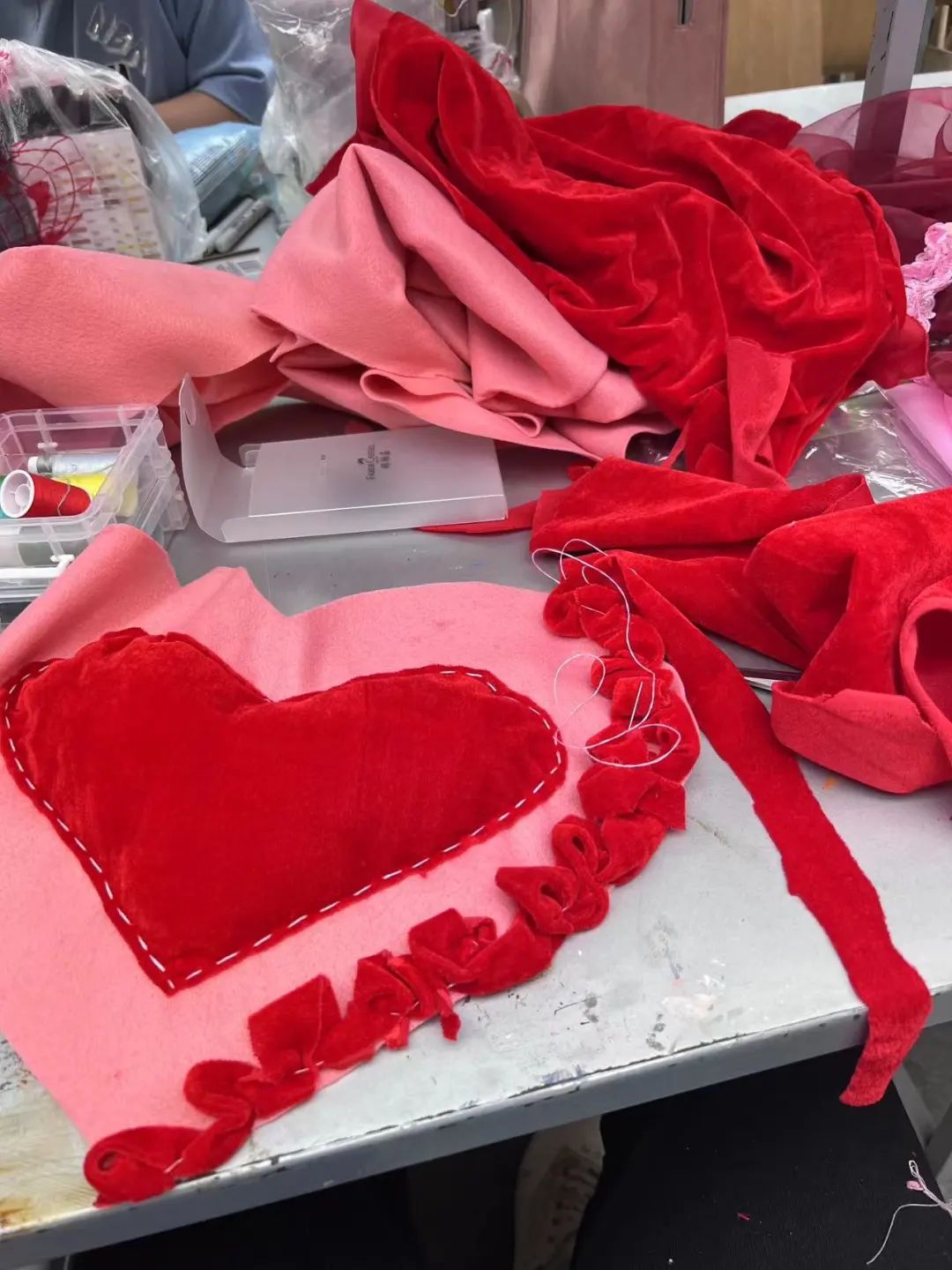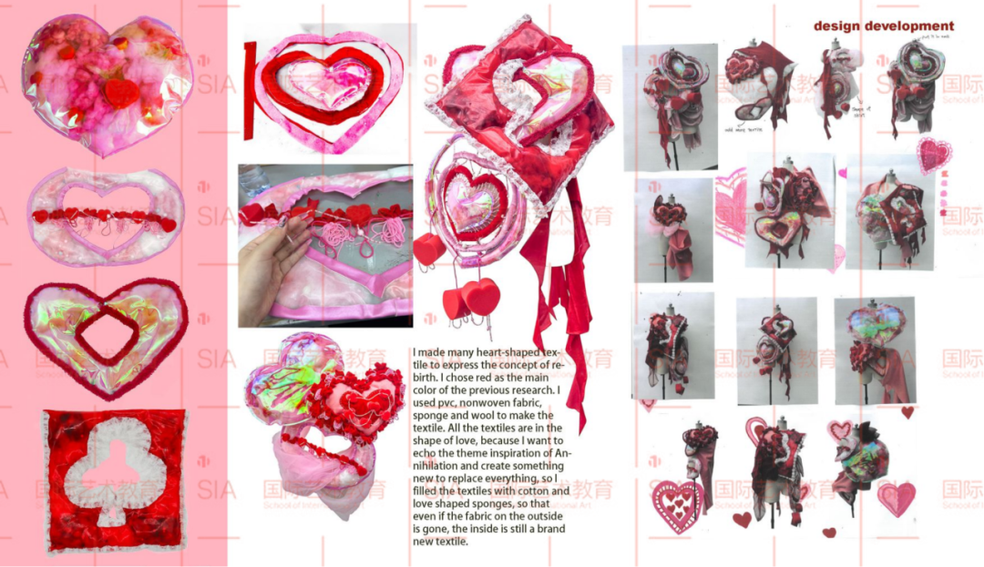 比如项目“ANNIHILATION”中,这个项目的灵感来源于《克苏鲁神话》的核心思想——人类对科学和未知领域的恐惧情绪,所以,为了将情绪具象化,我用聚氯乙烯、无纺布、海绵和羊毛等面料亲手制作了很多心形样式(即使把外面的心形外壳撕毁,里面仍然存在新的心形纺织品),以此呼应“毁灭过后是新生”的主题。