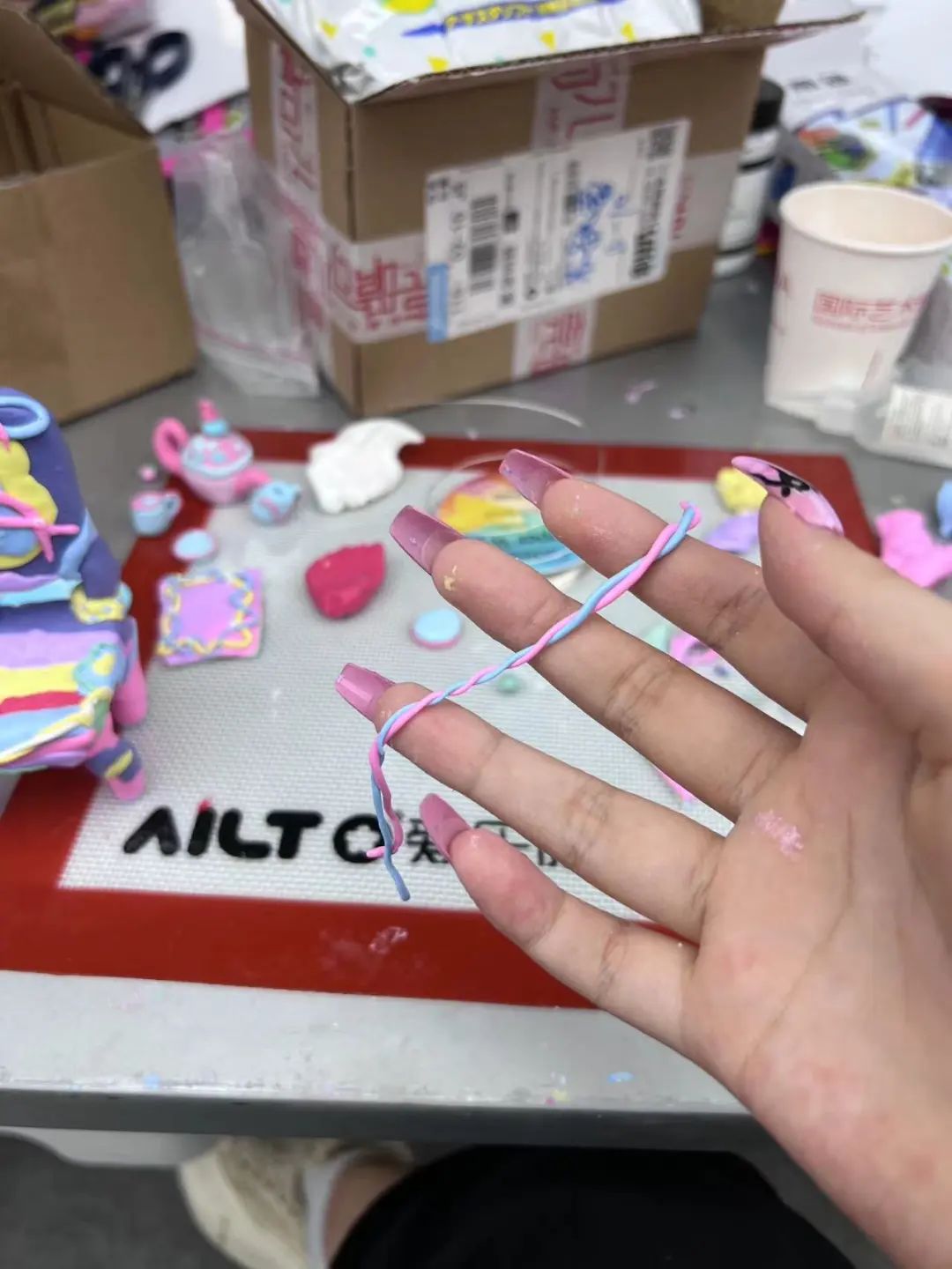 我用粘土塑造了梦中奇怪的石塑,并结合布料、毛线做成扭曲线条展现粘土,力求最大限度还原梦境。