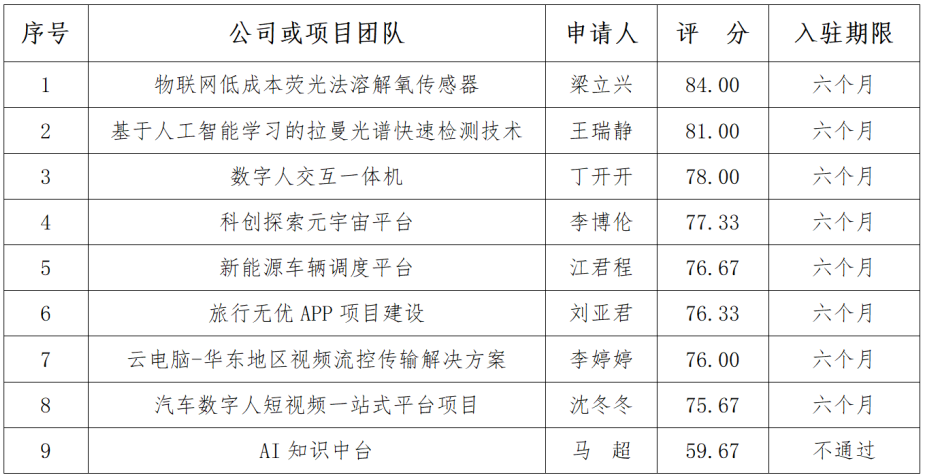 本次参加评审项目共9家,实到9家。项目申请人用6-7分钟进行项目介绍或展示。专家组根据现场交流和问答,对项目的创新性、可行性、团队执行力、社会效益和设备使用需求匹配性等进行评审。入驻评审结果公告如下: