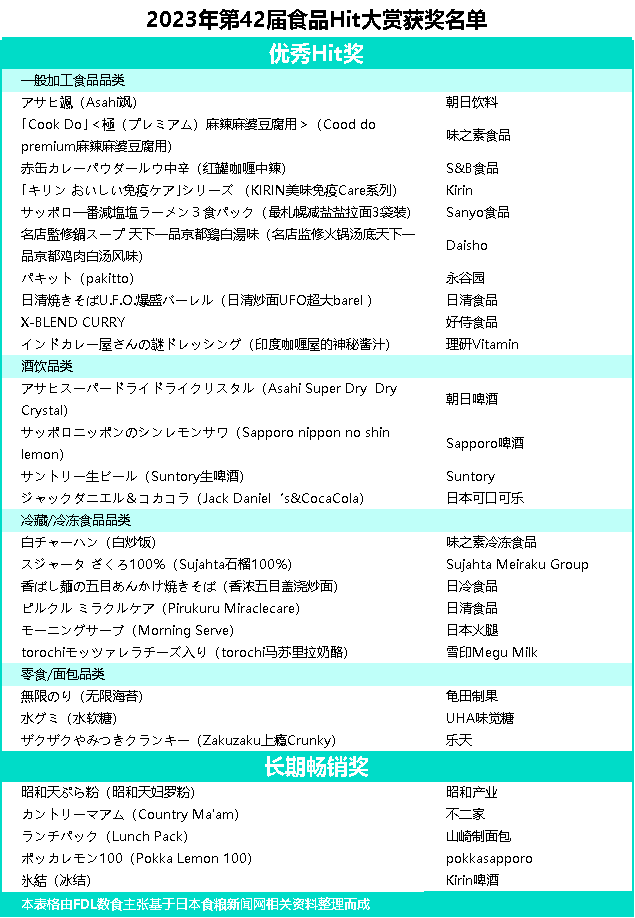 本届日本食品HIT大赏共有23款产品获得优秀Hit奖,5款产品荣获长期畅销奖,而食品Hit特等奖得主依旧空缺。颁奖仪式及庆典将于2024年2月15日在东京新大谷酒店举行。