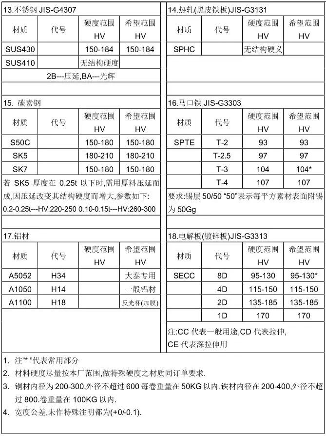 (1) 以下为常用金属材料的牌号及基本数据