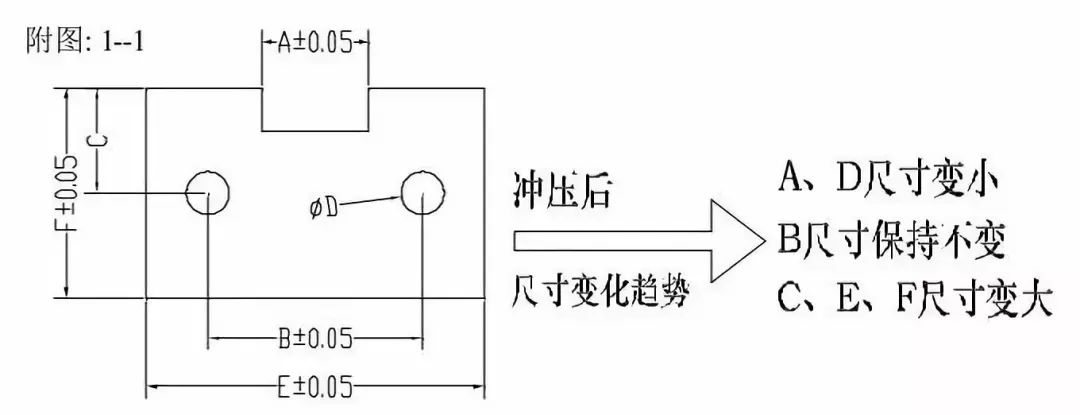 公差取值方向参考图 1-1。对于冲裁后会变大的尺寸,加工图尺寸为其下偏差的 2/3,对于冲裁后会变小的尺寸,加工图尺寸为其上偏差的 2/3。对于孔心距和孔边距等冲裁后尺寸基本保持不变的,则按中间公差取值。