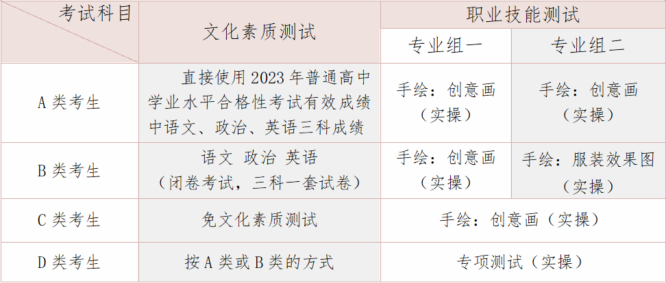 A类考生:文化素质测试成绩以学生取得的高中学业水平合格性考试语文、政治、英语三科有效成绩代替。职业技能测试由学校组织,学校分专业组,按照人才培养需要,采取实践操作方式进行,重点考察学生的创意能力。
