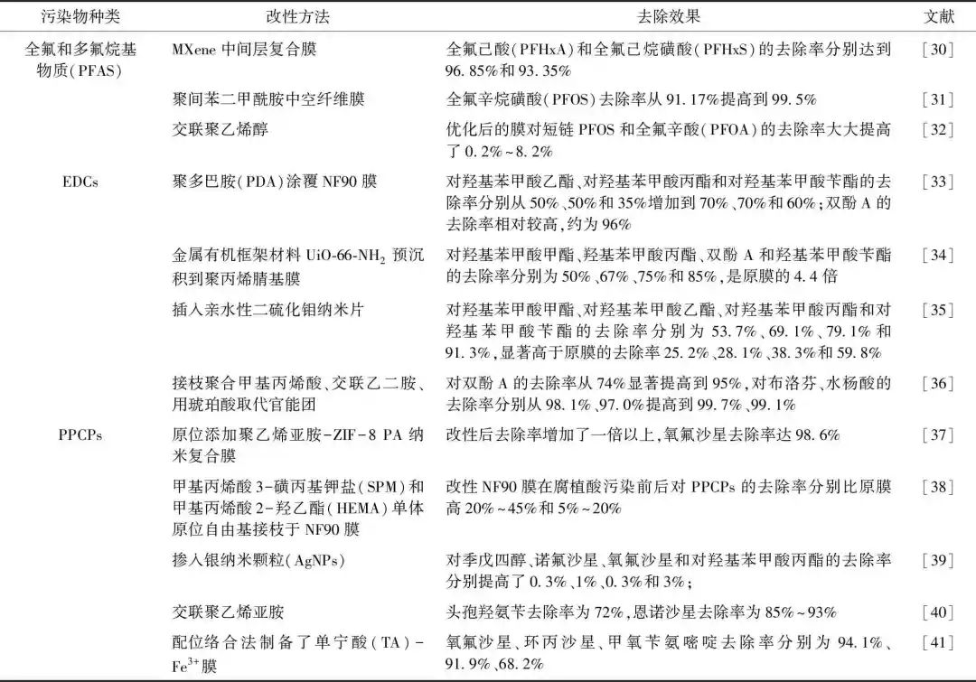 如前所述,新污染物的去除受疏水相互作用、静电作用和尺寸排阻的影响,因此,增强膜表面亲水性和选择性,在抑制新污染物吸附和通过膜表面起着关键作用。如表2所示,大量研究根据纳滤膜的分离机理,有针对性地对膜表面进行修饰或设计纳滤膜的结构和孔径大小,从而提高新污染物的去除率。