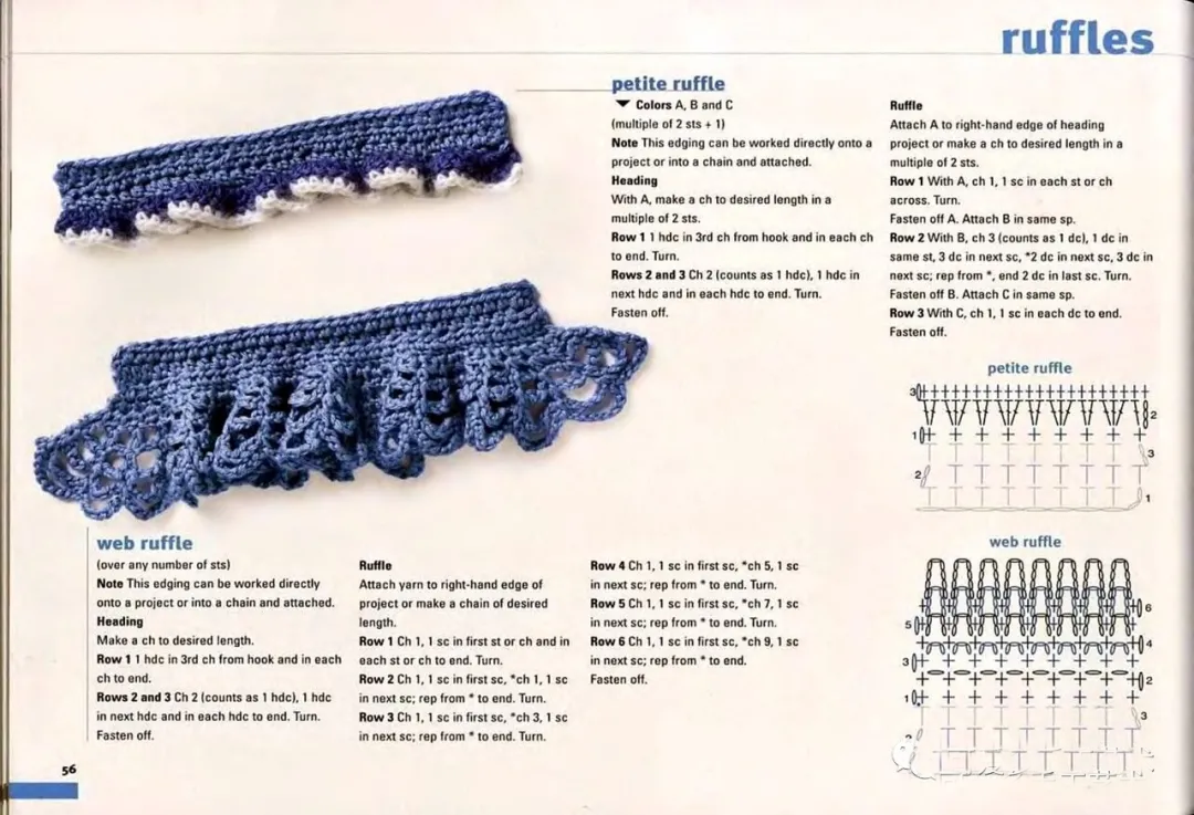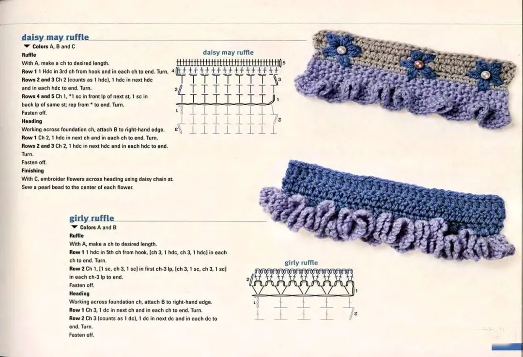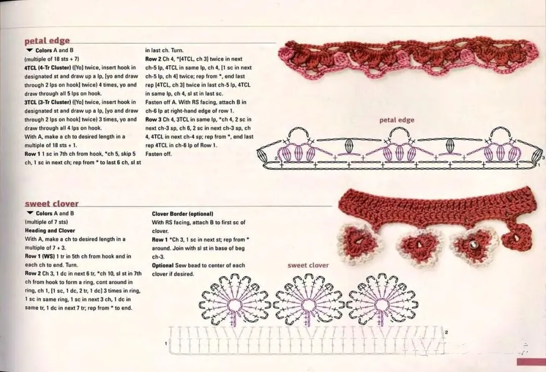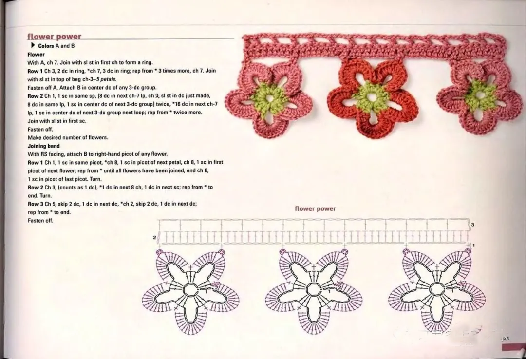 上一期小编给大家介绍了小花边的钩法,这一期有更多的花边图解,大家可以根据自己的选择去学着钩,给衣服钩一条花边缝上去或给家居用品来一场改造吧!
