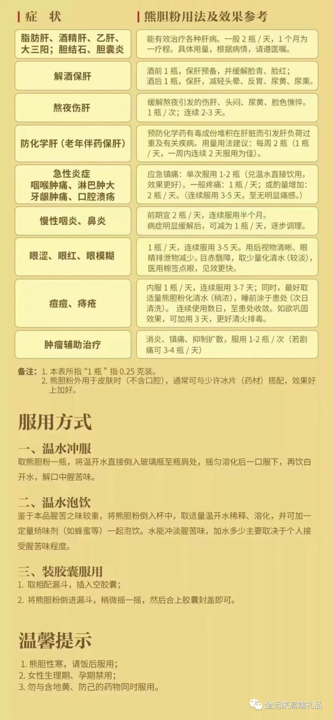 用10克熊胆粉兑500~1000毫升白酒,每日早餐前服用20~30毫升,睡前服用20~50毫升药酒。用此法,分春秋两季,一年服用熊胆粉20~30克,坚持就可根治关节炎、产后疾病、胃炎、肠炎等病症。也可防止肝炎、胆囊炎、角膜炎、初期白内障等眼科疾病。