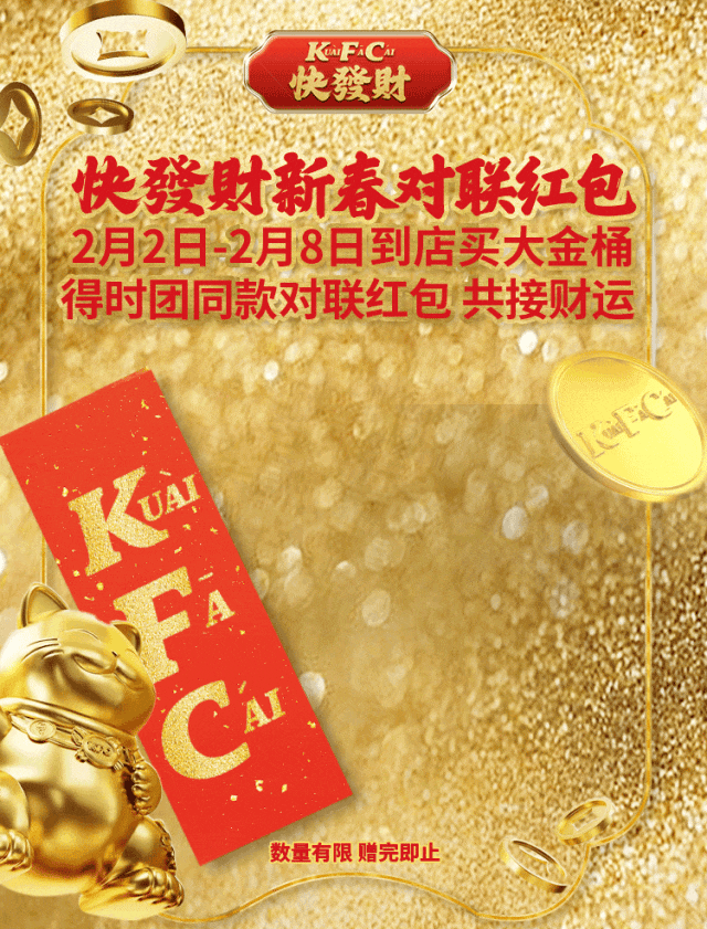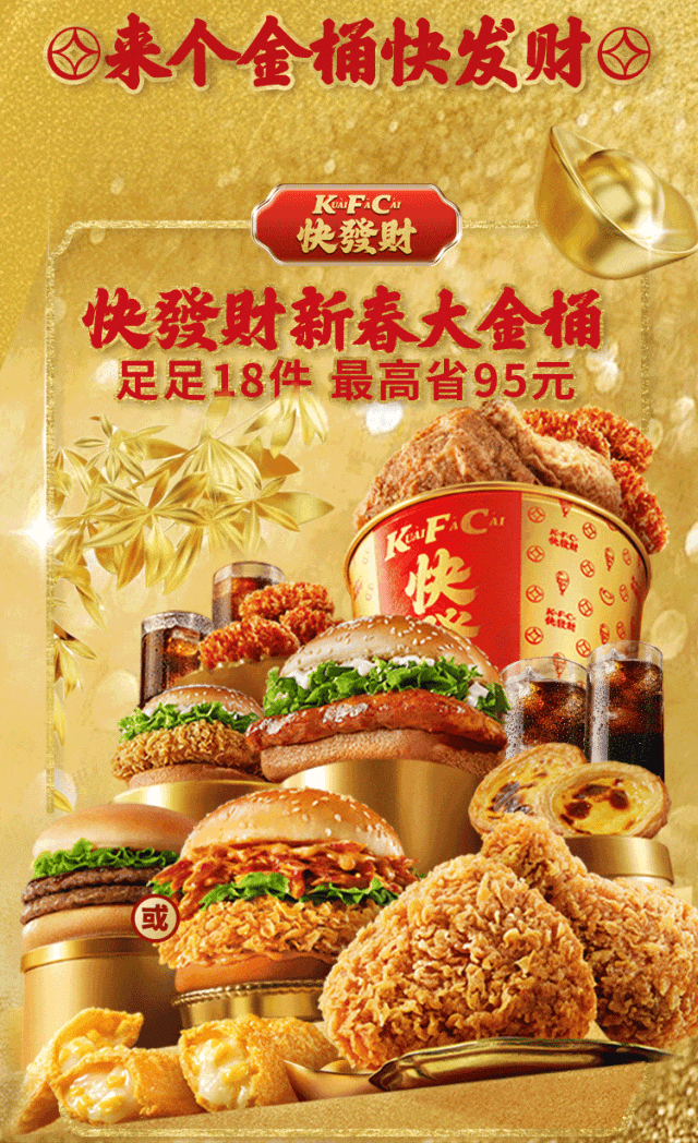快发财新春大金桶(4堡鸡版)和快发财新春大金桶(4堡牛版)自2024年1月22日起在全国上市,仅限9:30-23:00供应,广东省、福建省、海南省、广西壮族自治区等部分地区仅限10:30-23:00供应,具体以餐厅实际营业时间为准。在不售卖黄金玉米酪酪风味脆皮鸡的餐厅,产品将替换为吮指原味鸡;在不售卖吮指原味鸡的餐厅,产品将替换为黄金玉米酪酪风味脆皮鸡。活动渠道:堂食-柜台点餐/堂食-自助点餐机/堂食-自助点餐到店自取/外送-肯德基超级APP外送到家/外送-肯德基宅急送美团外卖平台/外送-肯德基宅急送饿了么外卖平台/外送-肯德基+微信小程序/外送-肯德基支付宝小程序。活动地区:全国。堂食具体供应时间以餐厅实际营业时间为准,仅限有此产品供应的部分肯德基餐厅,交通枢纽、旅游景区的餐厅及精选餐厅等部分餐厅除外,具体情况以餐厅餐牌公示为准。