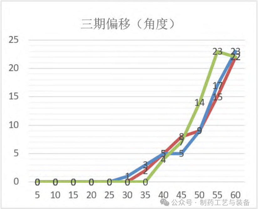 成立专门的小组,以每天生产最大产量,针对设备各部位在生产过程中造成的污染影响、设备使用频率、污染积累量等对产品质量的影响进行风险评估,收集历史数据和其他清洁知识,依据评估结果,针对不同的设备,制定相应的清洁周期,例如:30分钟、1天、1周、1月等规定时间周期(具体清洁周期以风险评估结果制定),从而保障设备稳定运行,降低设备对产品质量的影响。如图2三期偏移(角度)图所示,三期激光打印机以灰尘对传送带上小盒运行的影响来确定该部位清洁的周期。