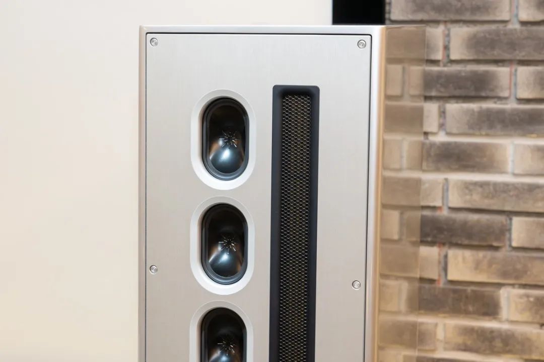 在 Mag 850 旁边,垂直排列七颗中音单元,振膜是椭圆形,中央有凹槽,这是 T+A 自家开发的 Star Stabilizer,可以抑制盆分裂,使用七颗单元排列,日中音与高音的长度相当,构成「线音源」发声。