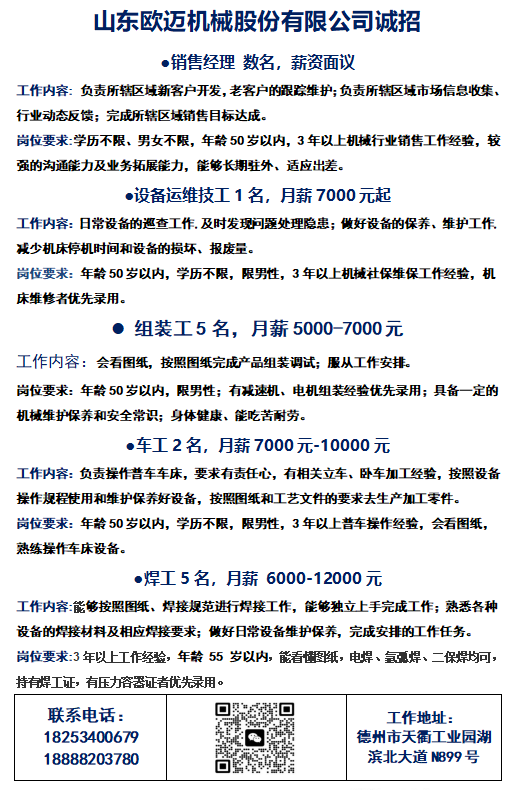 德州招聘:山东欧迈机械股份有限公司招聘