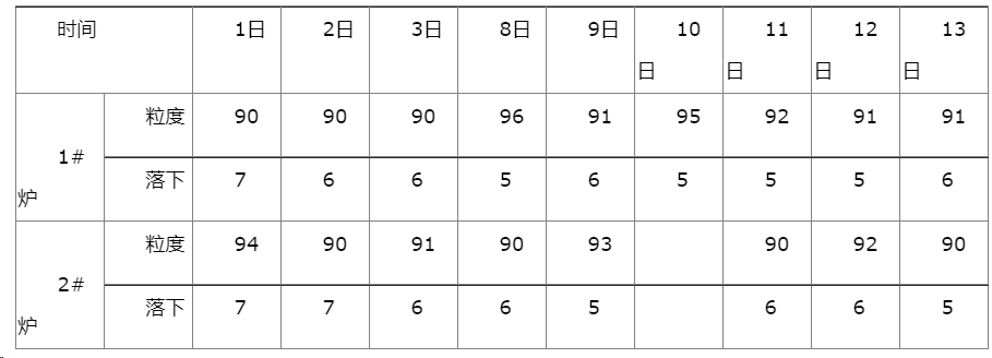 由上表可以看出,我厂所使用的膨润土为人工钠化的膨润土。因原料粒度过粗,导致膨润土的配比增加。为了降低在添加过程中的过分消耗,要求造球工必须掌握上料量和膨润土配比,以便掌握生球的各项指标,及时反馈信息,加以调整。目前我厂要求每小时对入炉生球做一次粒度和落下,与造球及时沟通,做到信息互通。为了保证入炉生球和落下的准确性,工艺人员每班不定期测三次以上入炉生球和造球盘生球的粒度和落下,加以对比,避免膨润土过量使用对造球质量和成品质量的影响。