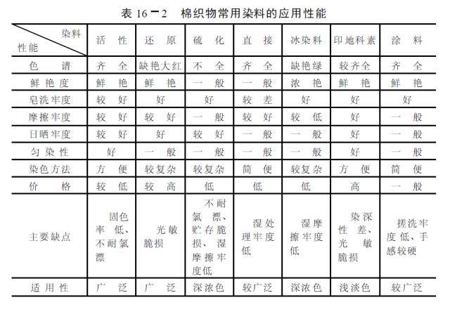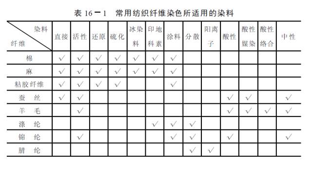 组成织物的纤维原料是染料选择最基本的依据。常用纺织纤维染色所适用的染料, 见表16-1所示。