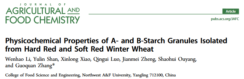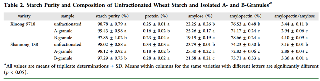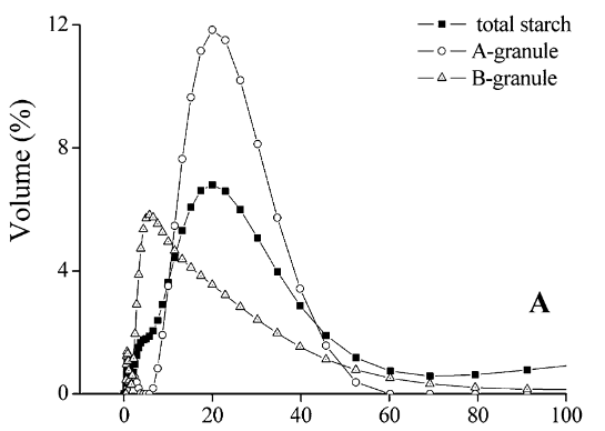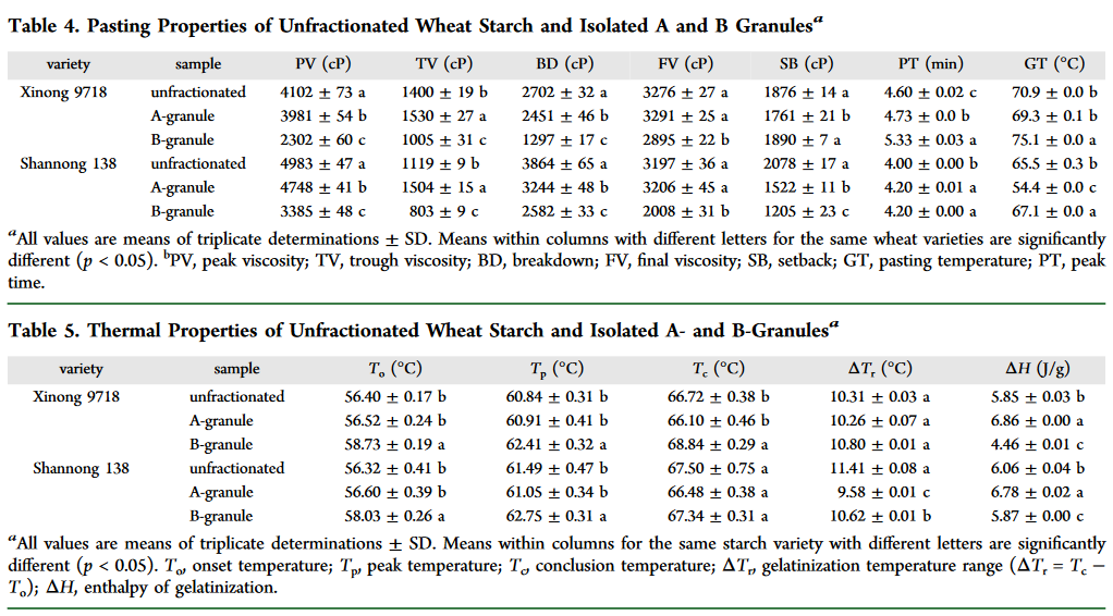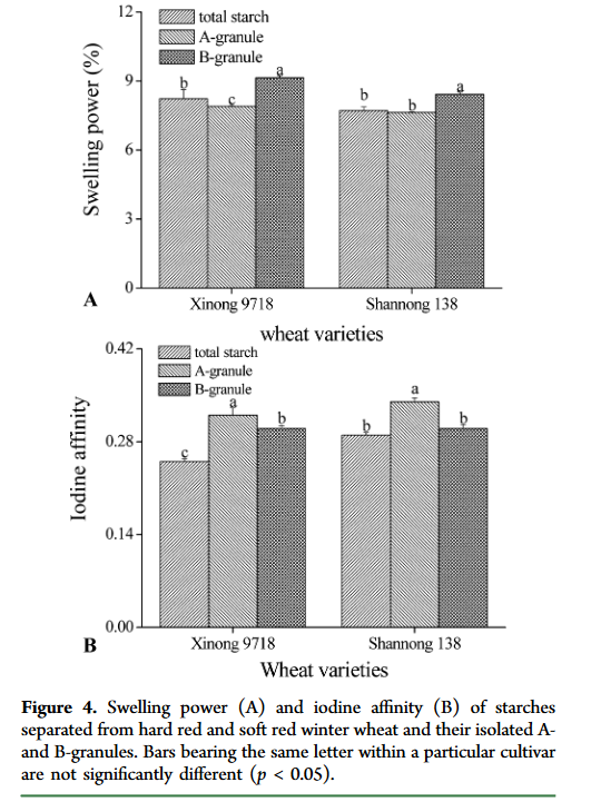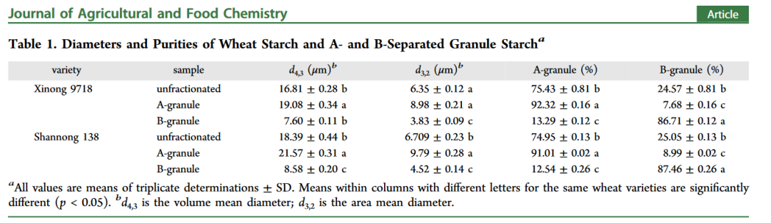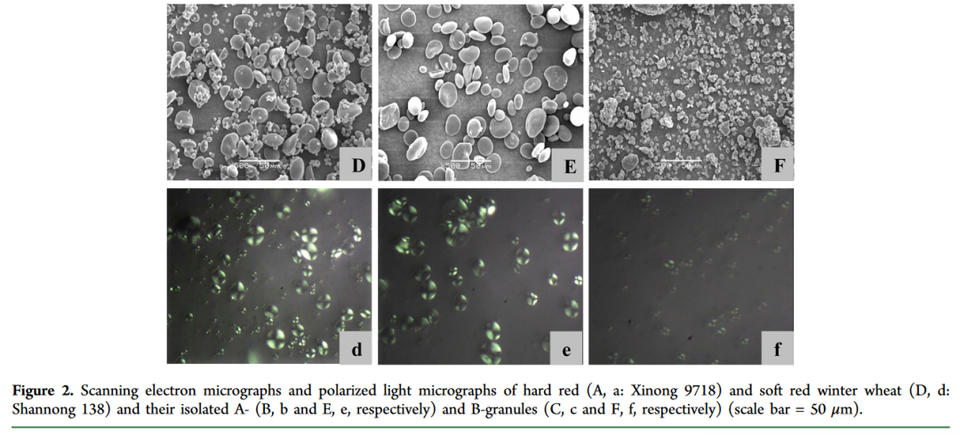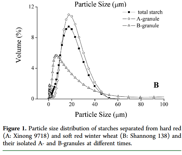 小麦(Triticum aestivum L.)是世界上最重要的谷类作物之一,是人类消费的主食之一。淀粉是小麦胚乳中含量最多的成分,占成熟小麦籽粒干重的60 ~ 65%,对最终产品的质量起着重要作用它是人类饮食中卡路里的主要来源之一,在许多食品工业中可用作增稠剂、胶凝剂、稳定剂和脂肪替代品。淀粉主要由两种类型的葡萄糖聚合物组成:直链淀粉和支链淀粉。直链淀粉是一种几乎线性的α-1,4-葡聚糖分子,含有约25 - 30%的小麦淀粉;支链淀粉是一种高度分支的分子,含有70 - 75%的小麦淀粉[1,2]。具体来说,人们普遍认为小麦淀粉具有双峰型粒度分布,根据其形状和大小可分为a型和b型。a型淀粉颗粒呈圆盘状或透镜状,平均直径为10 ~ 48 μm; b型淀粉颗粒粒径小于10 μm,呈球形或多角形[3,4]。据报道,小麦a型和b型淀粉颗粒在化学成分(如直链淀粉、支链淀粉、脂质和蛋白质含量)以及功能特性(如糊化和糊化特性、溶胀性、结晶性、酶敏感性和烘焙特性)方面存在差异[2,5]。早期研究表明,b -颗粒的脂质含量高于a -颗粒,而a -颗粒的直链淀粉含量高于b -颗粒A粒和b粒是在籽粒发育的不同时期在胚乳中形成的[6]。a粒在花后约4 ~ 5天开始合成,颗粒的生长发育一直持续到胚乳细胞分裂期结束,而b粒在花后10 ~ 14天形成,并持续扩大到花期后21天[1,6]。大小和形状的不同也导致了两种淀粉颗粒在食品和非食品应用中使用的类型不同。在小麦中,b型淀粉对面粉加工和面包制作质量有负面影响,但对面食制作有积极影响小麦a粒淀粉可用于无碳复写纸,小麦b粒淀粉是塑料薄膜填料的良好材料[6]。支链淀粉的颗粒大小和形状与支链淀粉的分子结构及其在颗粒内的分子排列有关[2]。长支链与短支链的比例影响支链淀粉分子的形状,从而影响支链淀粉分子的堆积,进而影响淀粉颗粒的形态和大小研究表明,小麦淀粉颗粒的理化性质和大小分布受遗传和环境的双重控制品种是影响小麦植株发育和淀粉积累的关键决定因素[8]。小麦品种按籽粒硬度可分为硬小麦和软小麦。小麦的籽粒硬度反映了胚乳的质地特征,是决定小麦制粉、烘烤和最终品质的重要因素之一。软质小麦品种比硬质小麦蛋白质含量低,更易磨粉,软质小麦面粉是饼干、法式面包、早餐食品等的首选,而硬质小麦面粉是制作面包的高品质面粉。对A-颗粒和b -颗粒的理化功能差异进行了一些研究。研究了硬红冬小麦和软红冬小麦品种淀粉和分离的A-和b -颗粒在形态、结构、理化、热、热等方面的特性。以小麦品种西农9718(硬红冬小麦)和山农138(软红冬小麦)为研究对象。它们是由中国杨凌西北农林科技大学农学院从2010年的收获中作为谷物提供的。使用实验室磨(磨型Perten 3100,瑞典Perten公司,瑞典)研磨小麦颗粒以获得全麦粉。所用的化学药品和试剂均为分析级。淀粉的分离