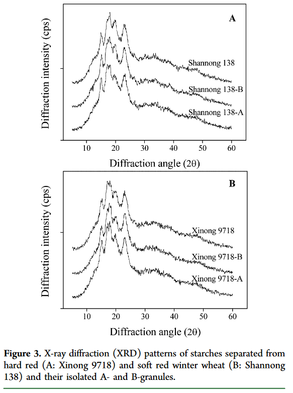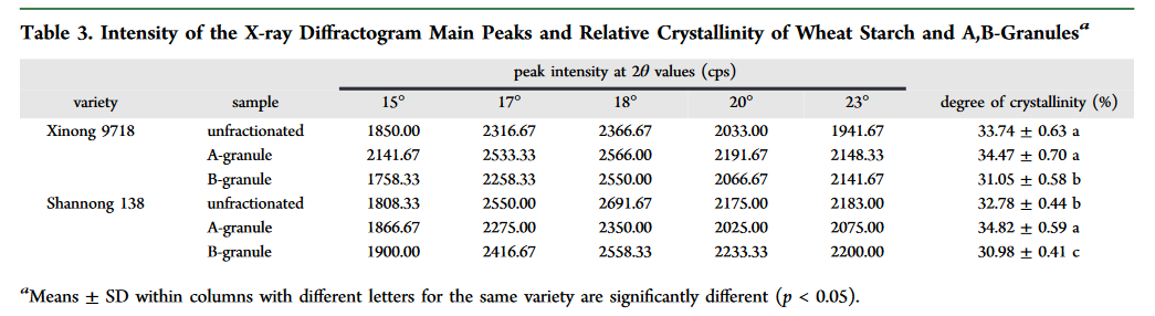 小麦淀粉的粒度分布及分离的A-和b -颗粒。未分馏小麦淀粉、A粒和b粒的体积和表面积的平均粒径见表1。两种未分选小麦淀粉颗粒的粒径分布均表现为双峰分布(图1A和B),平均粒径分别为16.81μm和18.39 μm(表1)。本实验中总淀粉组分的粒径分布结果显示(p <0.05)小麦淀粉中小b颗粒的比例高于a颗粒(表1)。a型颗粒的平均直径范围为18.39至19.08 μm,而b型颗粒的平均直径为7.60至8.58 μm(表1)。这些值与Kim和Huber(2010) 报道的结果一致,蜡质和普通软质小麦淀粉A型和b型的平均粒径分别为20.9 ~ 21.9 μm和6.2 ~ 6.3 μm。硬红和软红冬小麦淀粉分离得到的A型和b型颗粒分离纯度分别为91.0 ~ 92.32%和86.71 ~ 87.46%,表明A型和b型淀粉分离颗粒之间存在污染。扫描电子显微镜照片和显微镜观察。从两个淀粉品种中分离出的未分馏小麦淀粉和A-和b颗粒的扫描电子显微图如图2A−F所示。两种未分选小麦淀粉颗粒的扫描电镜也显示出明显的双峰模式,大淀粉颗粒被许多小淀粉颗粒包围(图2A和D)。大淀粉颗粒表面光滑,呈圆盘状或透镜状,直径在10 ~ 40 μm之间(图2B和E),分离的淀粉颗粒呈不规则、球形或多边形,直径约为2 ~ 5 μm。此外,通过扫描电镜观察,a型淀粉颗粒被b型淀粉颗粒污染的程度非常小,b型淀粉颗粒也被一些圆盘状的a型淀粉颗粒污染,这与粒径分布分析相吻合。A型淀粉颗粒在开花后第4天形成,并可在整个灌浆期继续生长,而b型淀粉颗粒在开花后第12 ~ 14天形成,颗粒大小可增大至10 μm,这导致A型和b型淀粉颗粒的大小和形状不同的区别。颗粒的大小和形状可能影响这些小麦淀粉的物理化学和功能特性。图2a−f显示了从两个小麦品种中分离出的未分馏淀粉颗粒和A-淀粉颗粒和b -淀粉颗粒的双折射显微照片。所有淀粉颗粒在偏振光下表现出典型的“马尔济斯交叉”。可以看出,未分选的小麦淀粉颗粒(图2a和d)没有明显的差异。然而,与a -淀粉颗粒(图2b和e)相比,b -淀粉颗粒(图2c和f)表现出相对较弱和模糊的“马耳他十字”(Maltese cross)。由于晶体的径向取向,已知偏振光下的双折射现象,这揭示了颗粒的结晶组织因此,b -淀粉颗粒的弱“马耳他十字”可能是由于它们在颗粒内的结晶组织较低。小麦淀粉的组成及分离的A-和b颗粒。对未分馏小麦淀粉及其A-和b颗粒的组成,包括总淀粉、直链淀粉、支链淀粉和蛋白质含量,以及支链淀粉/直链淀粉的比例进行了分析,结果见表2。由于植物组织中含有蛋白质、脂质、纤维、矿物质等其他成分,从植物组织中获得纯淀粉相当困难。所有样品的淀粉纯度(以干基表示)均大于97.0%,纯度较高。其中,所有样品的淀粉纯度(以干基表示)均大于97.0%,说明其纯度较高。两个小麦品种的蛋白质含量均以b粒最高,a粒最低。直链淀粉含量在未分级淀粉中差异不显著(p<0.05)(表2)。a -颗粒中直链淀粉含量分别为25.26%和25.30%。西农9718和山农138)极显著(p <0.05),高于未分馏淀粉(分别为22.25%和23.79%)和b粒(分别为19.19%和21.58%)。这些结果与以前关于小麦、小黑麦和大麦淀粉以及普通和部分糯小麦淀粉的报道一致直链淀粉构成淀粉颗粒中的无定形部分,淀粉颗粒中直链淀粉含量越高,淀粉的结晶度越低因此,b粒淀粉的结晶度可能比a粒淀粉低。而a粒的支链淀粉含量和支链淀粉/直链淀粉比值则相反。两个品种a粒的支链淀粉含量和支链/直链淀粉比值均显著(p<0.05)低于未分馏淀粉和b粒,而b粒的支链淀粉含量和支链/直链淀粉比值最高(表2)。淀粉粒的支链淀粉含量和支链/直链淀粉比值与淀粉结晶结构有关。在本研究中,未分馏淀粉和A型或b型颗粒的化学成分约98%以上是直链淀粉和支链淀粉,其中70%以上是支链淀粉。支链淀粉的含量和结构对淀粉颗粒的理化特性和功能特性起着至关重要的作用。在未分级淀粉中差异不显著(p <0.05)(表2)。a -颗粒中直链淀粉含量分别为25.26%和25.30%。西农9718和山农138)极显著(p<0.05),高于未分馏淀粉(分别为22.25%和23.79%)和b粒(分别为19.19%和21.58%)。这些结果与以前关于小麦、小黑麦和大麦淀粉以及普通和部分糯小麦淀粉的报道一致。直链淀粉构成淀粉颗粒中的无定形部分,淀粉颗粒中直链淀粉含量越高,淀粉的结晶度越低因此,b粒淀粉的结晶度可能比a粒淀粉低。而a粒的支链淀粉含量和支链淀粉/直链淀粉比值则相反。两个品种a粒的支链淀粉含量和支链/直链淀粉比值均显著(p <0.05)低于未分馏淀粉和b粒,而b粒的支链淀粉含量和支链/直链淀粉比值最高(表2)。淀粉粒的支链淀粉含量和支链/直链淀粉比值与淀粉结晶结构有关。在本研究中,未分馏淀粉和A型或b型颗粒的化学成分约98%以上是直链淀粉和支链淀粉,其中70%以上是支链淀粉。支链淀粉的含量和结构对淀粉颗粒的理化特性和功能特性起着至关重要的作用。x射线衍射分析。未分馏淀粉和A、b颗粒的x射线衍射图如图3所示。表3给出了两种小麦淀粉品种的x射线衍射图对应的主峰强度和未分选颗粒、A粒和b粒的相对结晶度。未分馏淀粉A和B淀粉,各小麦品种的b粒均表现出相似的x射线衍射图,衍射峰在15°、17°、18°、20°和23°附近最强(图3A和b),属于典型的a型结晶度。淀粉在峰强度值和相对结晶度上存在差异。西农9718的a粒峰值强度高于其未分选淀粉和b粒,而山农138的a粒峰值强度最低(表3)。这可能是由于两种淀粉品种在蛋白质、直链淀粉和支链淀粉含量上的差异。结晶度是根据x射线衍射图的总面积和无定形面