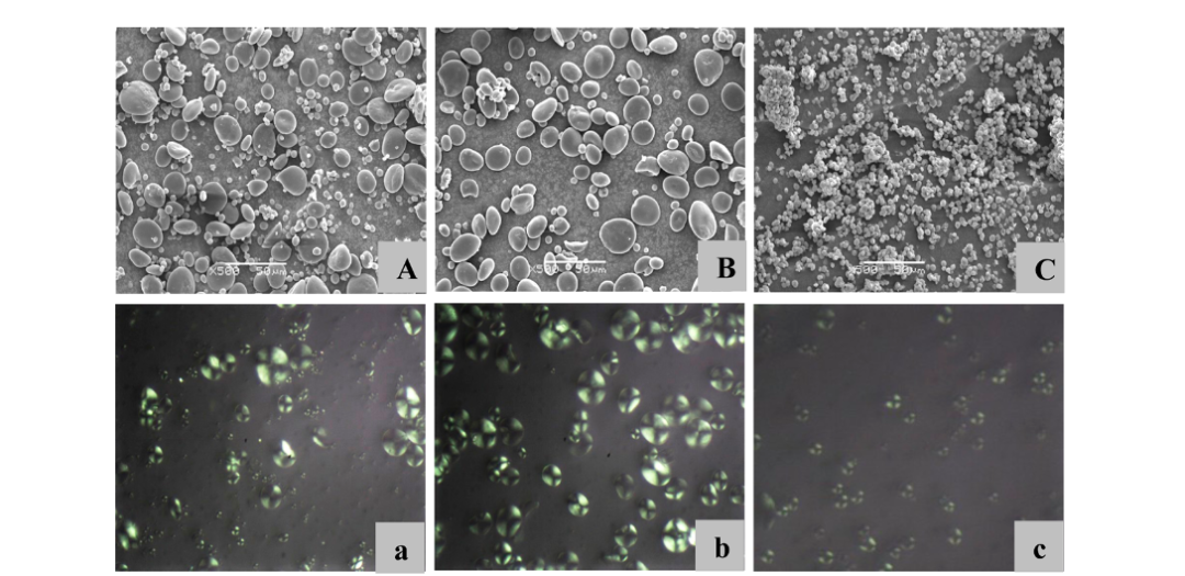 总淀粉、直链淀粉和支链淀粉含量采用Jarvis和Walker(1993)报道的比色法测定根据AACC方法46−30 (AACC 2000)测定淀粉中的蛋白质含量结果是在干燥的基础上报告的。光学显微镜。将淀粉样品悬浮在甘油溶液(甘油/H2O2, v/v)中,使用40倍物镜的偏光显微镜(DMBA400, Motic中国集团有限公司,中国广州)进行观察。
