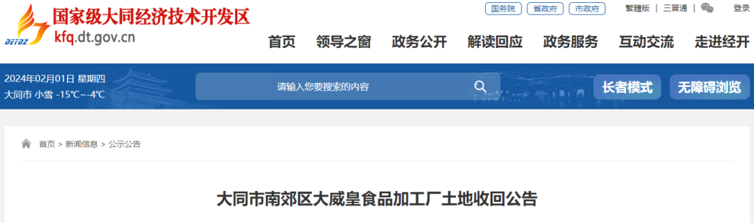 大同市南郊区大威皇食品加工厂与大同市规划和自然资源局开发区分局(原山西省国土资源厅大同经济技术开发区土地分局)2009年8月12日签订了《国有建设用地使用出让合同》(合同电子监管号:1402272009B00146),取得方式为出让,出让年期为50年,用途为工业用地,四至为:东邻大同市东瑞物资有限责任公司,南邻建昌街,西邻(保密中心),北邻南环路,面积为1.2166公顷(合18.25亩)。经与大同市南郊区大威皇食品加工厂协商,我分局拟有偿收回该宗土地使用权,土地补偿费用为470.82万元,同时终止2009年8月12日签订的《国有建设用地使用出让合同》(合同电子监管号:1402272009B00146)。