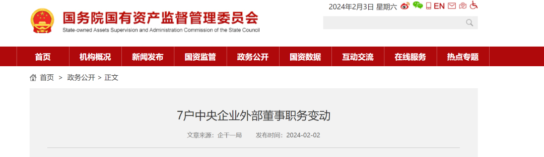 国务院国资委网站2月2日消息,7户中央企业外部董事职务变动。其中包含三峡集团、国家能源集团、东方电气、中海油4家能源央企。