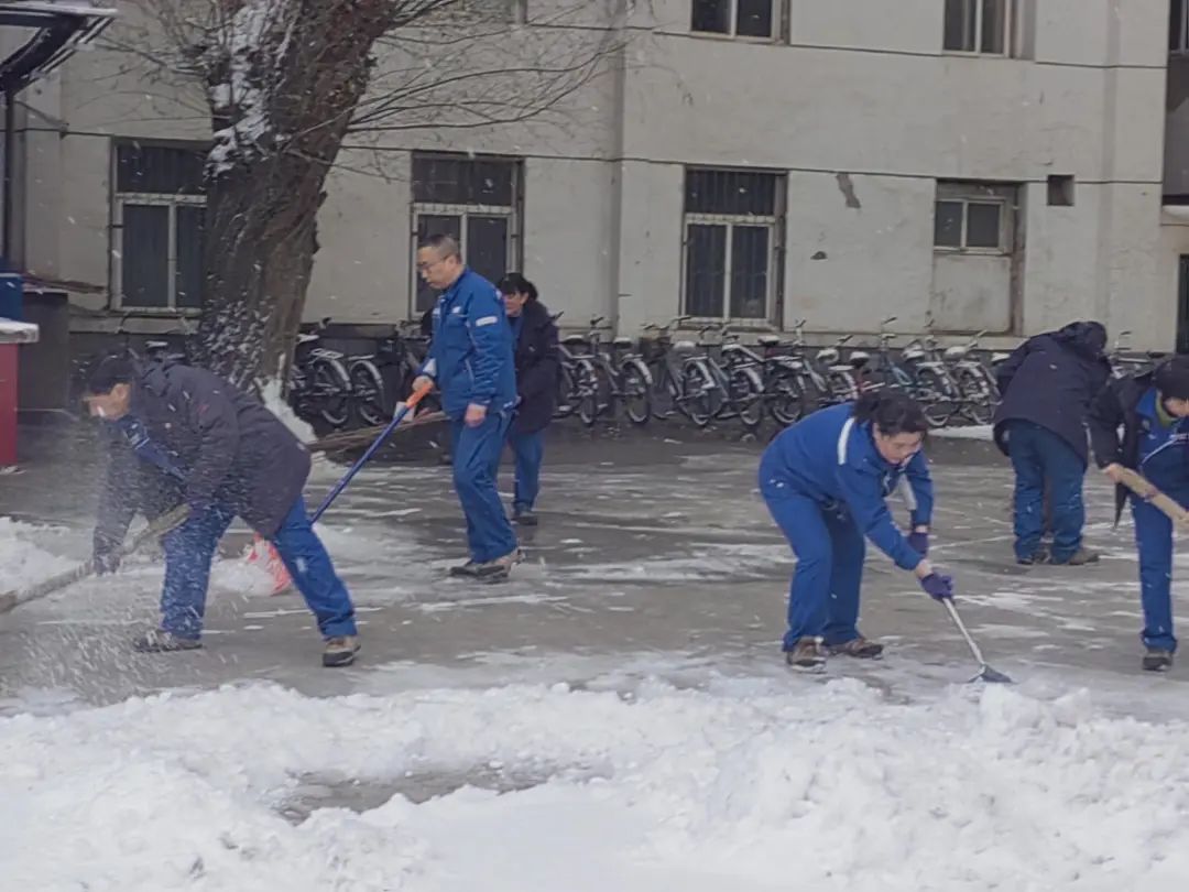 化工质检二室党员干部,纷纷拿起铁锹、扫帚等工具对属地积雪进行清扫,大家铲雪、扫雪,相互配合、齐心协力,一点点地将积雪和结冰铲起集中堆放。虽然天气寒冷,但凛冽的寒风丝毫阻挡不住大家的劳动热情。手中的扫雪工具不停地挥舞着,经过一个多小时的共同努力,质检室属地周围的积雪、结冰被清除干净。