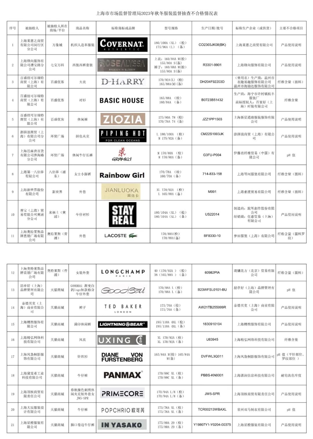 针对消费者投诉、举报集中及以往抽检发现质量问题较多的产品,近期,上海市市场监管局集中组织力量对黄浦、徐汇、静安等8个区以及天猫商城、淘宝和小红书3个网络平台销售的80个品牌80批次秋冬服装进行了监督抽查。经检测,有21批次不合格,不合格检出率为26.3%。检测项目涉及甲醛含量、可分解致癌芳香胺染料、色牢度、抗起毛起球性等14项,本次抽查不合格项目主要是纤维含量、pH值、耐皂洗色牢度、产品使用说明4项。