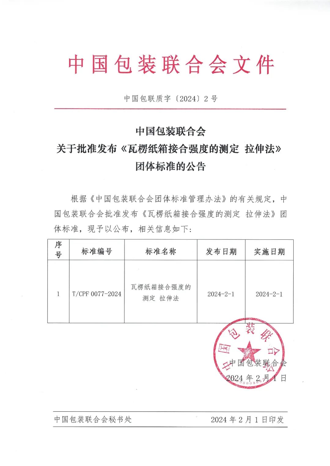 【关注】中国包装联合会关于批准发布《瓦楞纸箱接合强度的测定 拉伸法》 团体标准的公告