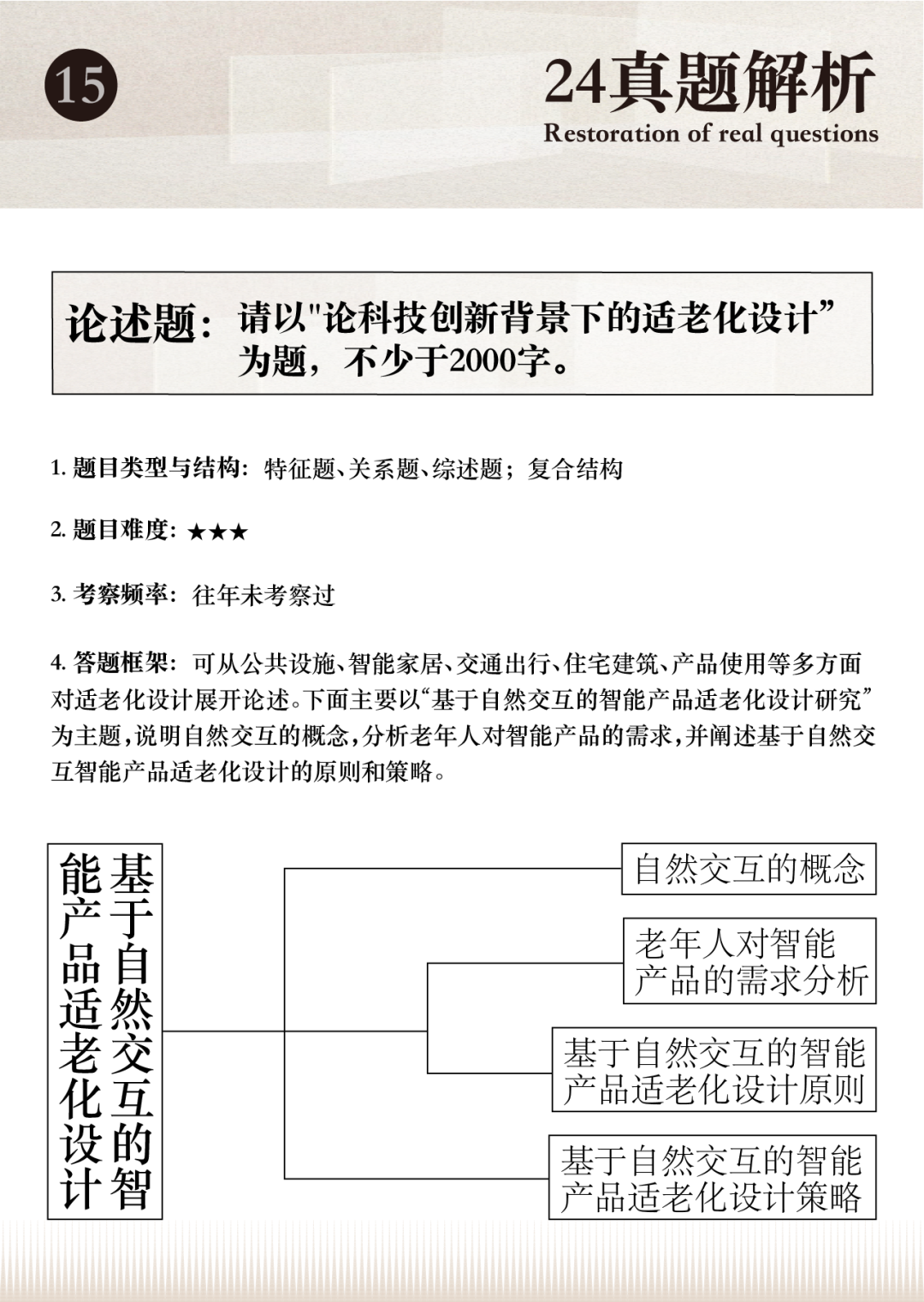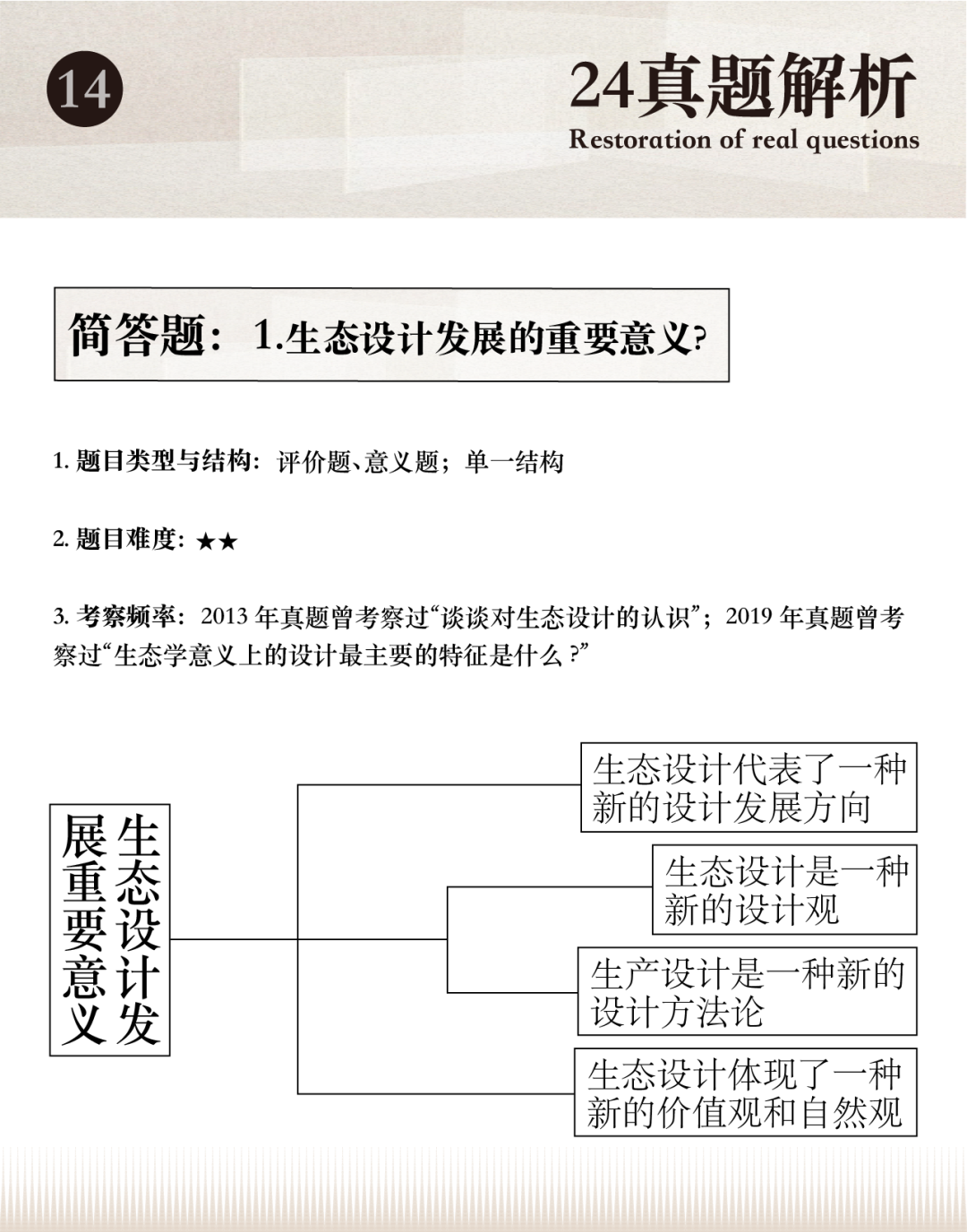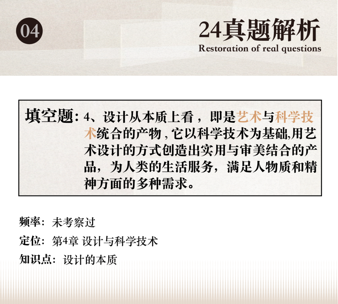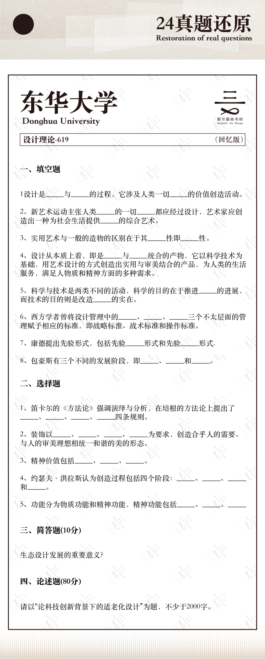 东华大学这门理论专业课的考察还是相对常规的。以24年最新真题为例,首先,从考察范围来看,试题的分布是相对均衡的,从1-9章均有分布,其中填空题和选择题主要分布在2-6章,而简答题和论述题主要分布在第9章。其次,从考察内容来看,大部分为章节重点内容,不过也有一些比较细的知识点,例如填空题第4题所对应的知识点是参考书上第四章最前面的引言部分,可见我们在平常的学习中就要做到认真细致,不放过任何一个可能会考察到的书本知识。最后,从考察趋势来看,简答题和论述题不仅考察了课本知识,还把握住了今年的热点话题——“生态设计”与“适老化设计”。