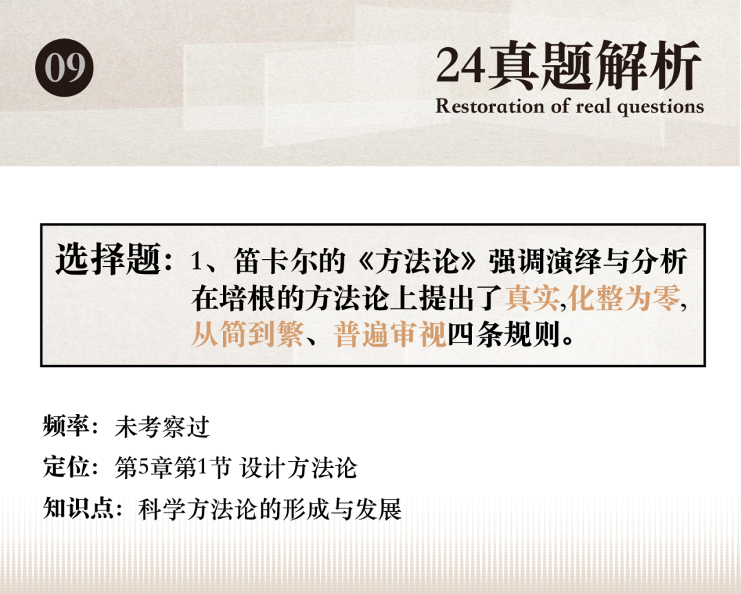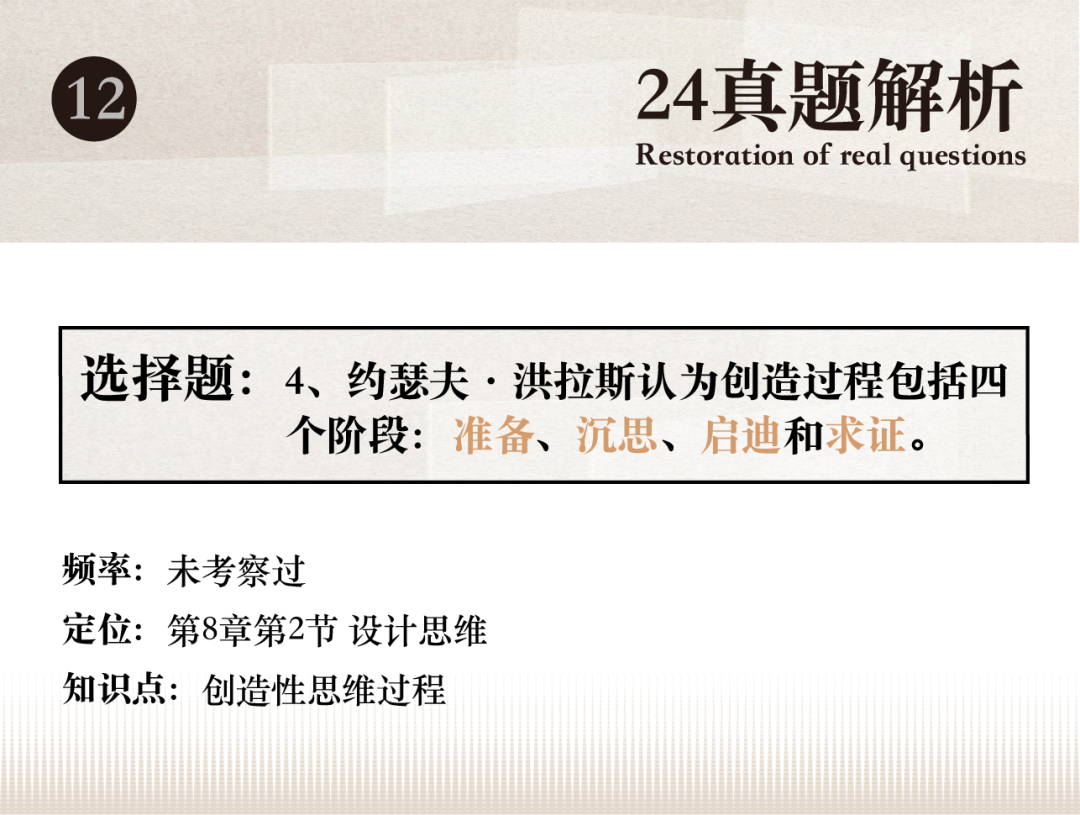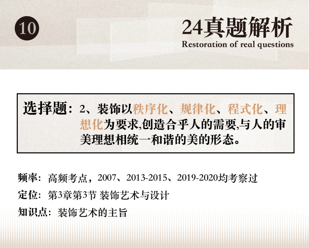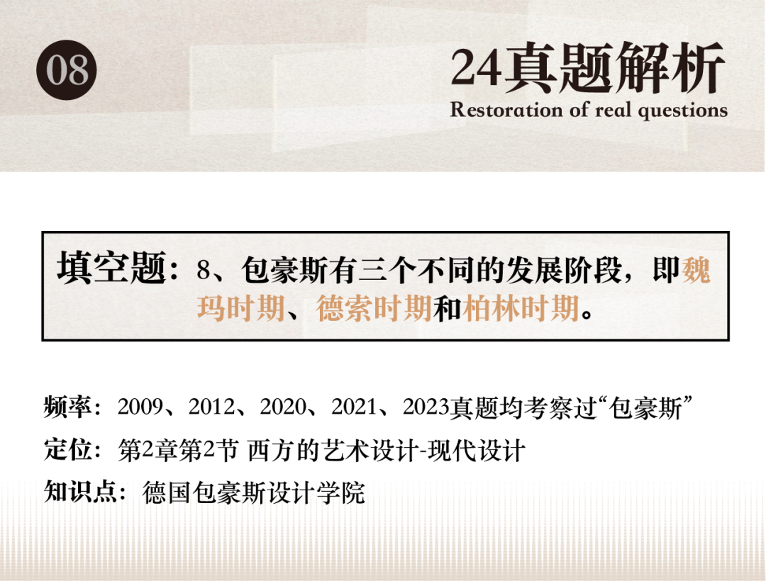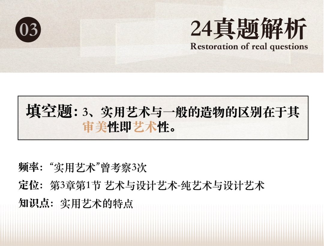 东华大学这门理论专业课的考察还是相对常规的。以24年最新真题为例,首先,从考察范围来看,试题的分布是相对均衡的,从1-9章均有分布,其中填空题和选择题主要分布在2-6章,而简答题和论述题主要分布在第9章。其次,从考察内容来看,大部分为章节重点内容,不过也有一些比较细的知识点,例如填空题第4题所对应的知识点是参考书上第四章最前面的引言部分,可见我们在平常的学习中就要做到认真细致,不放过任何一个可能会考察到的书本知识。最后,从考察趋势来看,简答题和论述题不仅考察了课本知识,还把握住了今年的热点话题——“生态设计”与“适老化设计”。