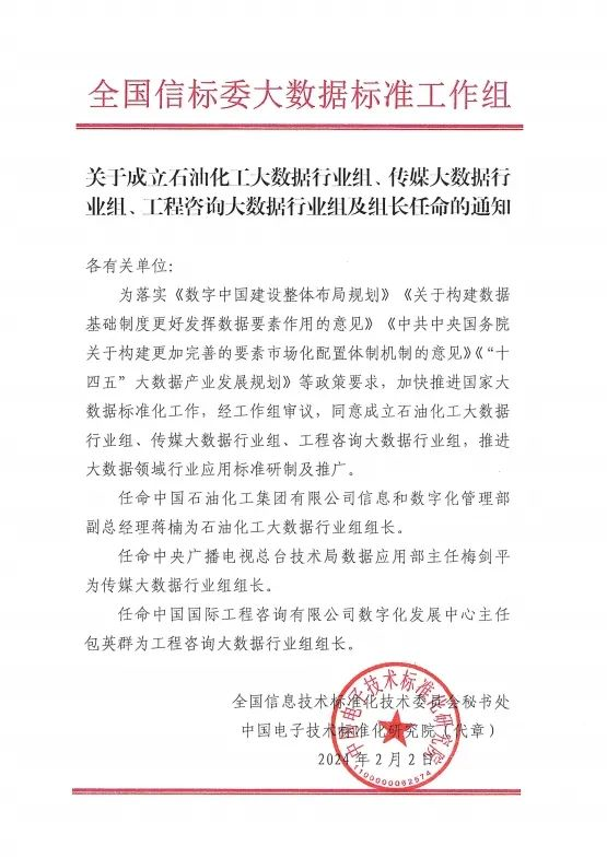 全国信标委大数据标准工作组关于成立石油化工大数据行业组、传媒大数据行业组、工程咨询大数据行业组及组长任命的通知