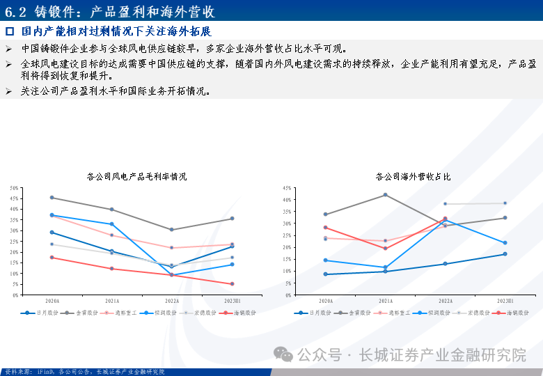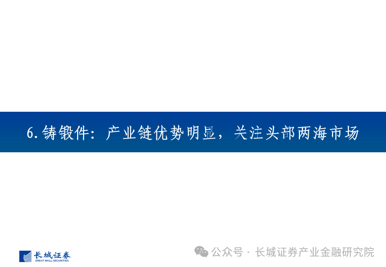 海风高成长性叠加单机大型化,带动部件环节需求高增,出货与盈利回暖可期。塔架、海缆直接受益海风提振,零部件支撑全球风电装机。海缆企业加强区位布局,产能释放业绩弹性较大;海风塔架长期供给充足,有望缓解全球供应链瓶颈;铸锻件及其他零部件占据主导地位,产能弥补全球缺口。全球风电建设进程加速,国际市场在通货膨胀成本上涨、供应链危机等情形下或出现产能不足,为我国供应商提供出海机会,拉动产能利用率,长期出货和盈利能力有望提升。