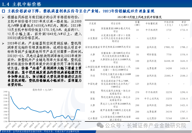 风电装机需求同比改善,主机价格下探传导至产业链各环节,盈利短期承压。2023年风电装机重回正向增长,海上风电装机较不及年初预期。招投标市场主机中标价格不断下探,传导至交付订单叠加部分原材料采购成本攀升,共同导致产业链利润空间承压,全年风电设备板块表现较弱。进入Q3以来,国家和地方层面利好政策频出,推动项目建设加速,逐月装机需求端同比改善明显,全年新增装机超75GW。陆风中标价格现触底回升迹象,海风项目集中核准、竞配、并网,为未来两年装机高增长、盈利回暖奠定基础。