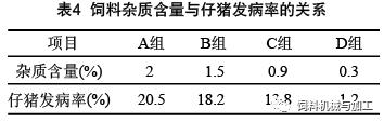 在目前玉米高价行情下,用小麦代替部分玉米对节约饲料成本具有重要意义。但小麦中杂质含量较高,除去小麦中的杂质是使用好小麦的关键所在。小麦中非淀粉多糖含量较玉米高,加之淀粉含量高、粘性大,在用小麦代替玉米时应在加工工艺方面做适当改变,同时应选用高品质的酶制剂和低压缩比环模。普遍认为饲料企业原料的除杂工艺,应重视磁选筛选即保护设备,其实在重视保护设备的同时,更应重视清理谷物(玉米、小麦、稻谷)等原料中的碎屑(碎粒、被氧化的颗粒、沙粒等)及隐藏在碎屑中的各种霉菌毒素和有害细菌。据相关研究得出,使用彻底清选的小麦与玉米,仔猪发病率明显降低(见表4)。2.3 原料的粉碎工艺